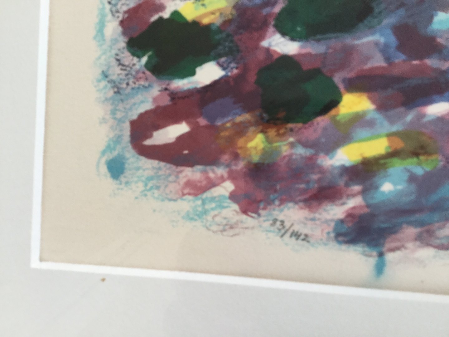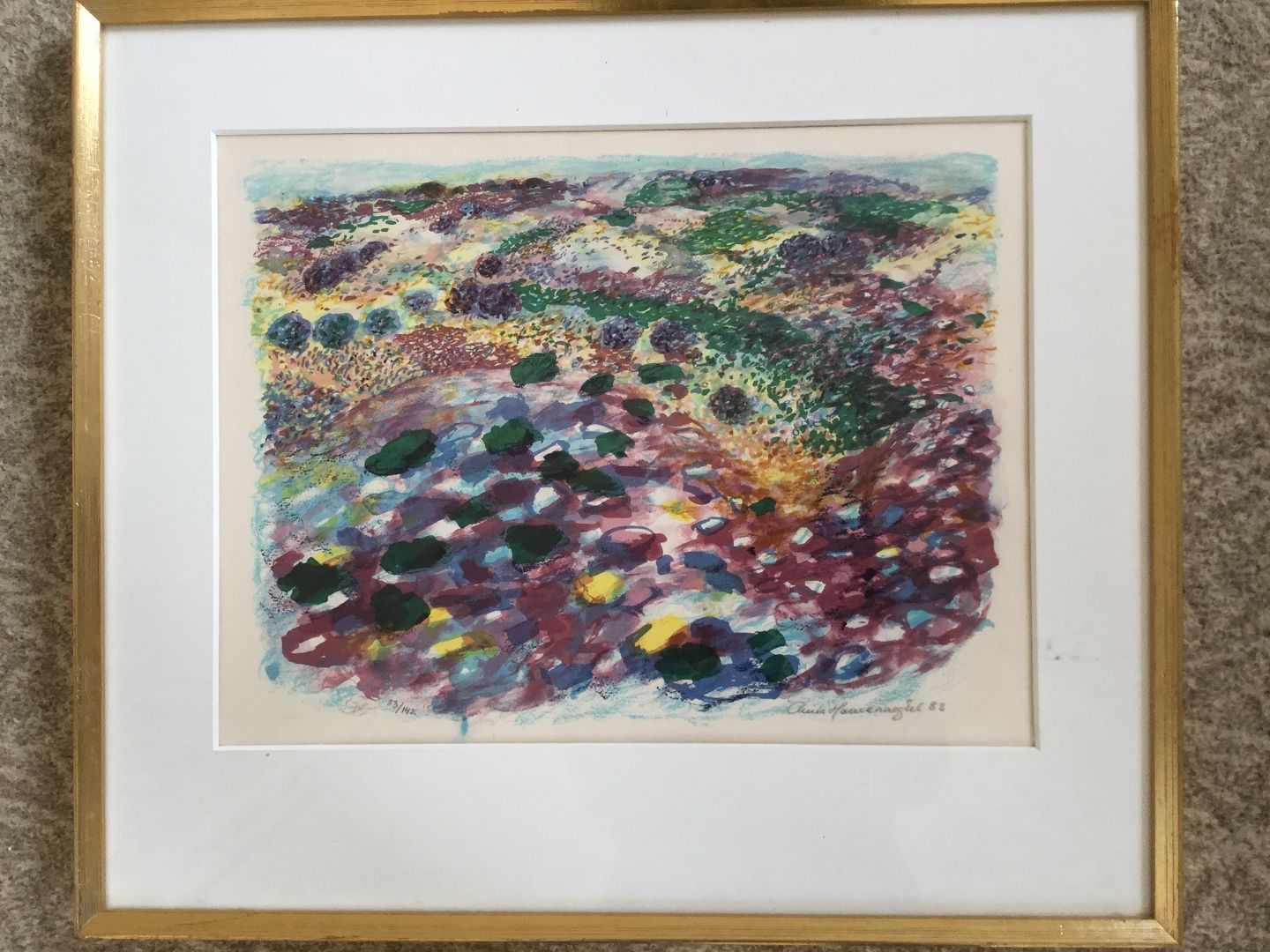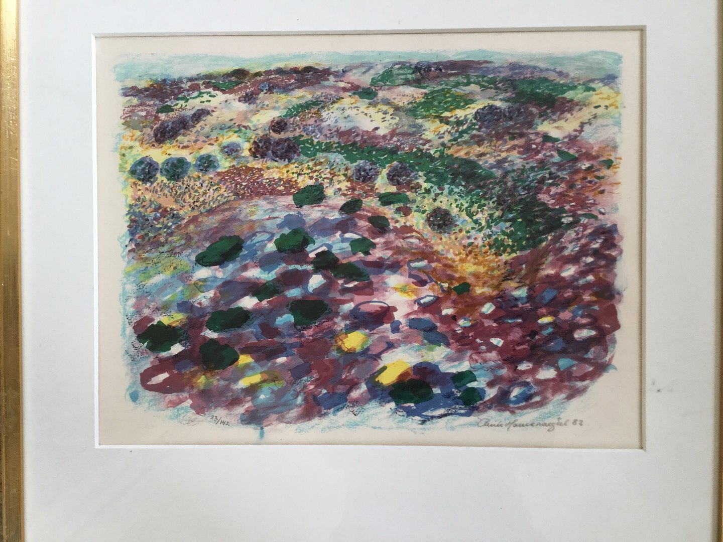 Farvelitografi af Anita Houvenaeghel - Landskab 1983.
