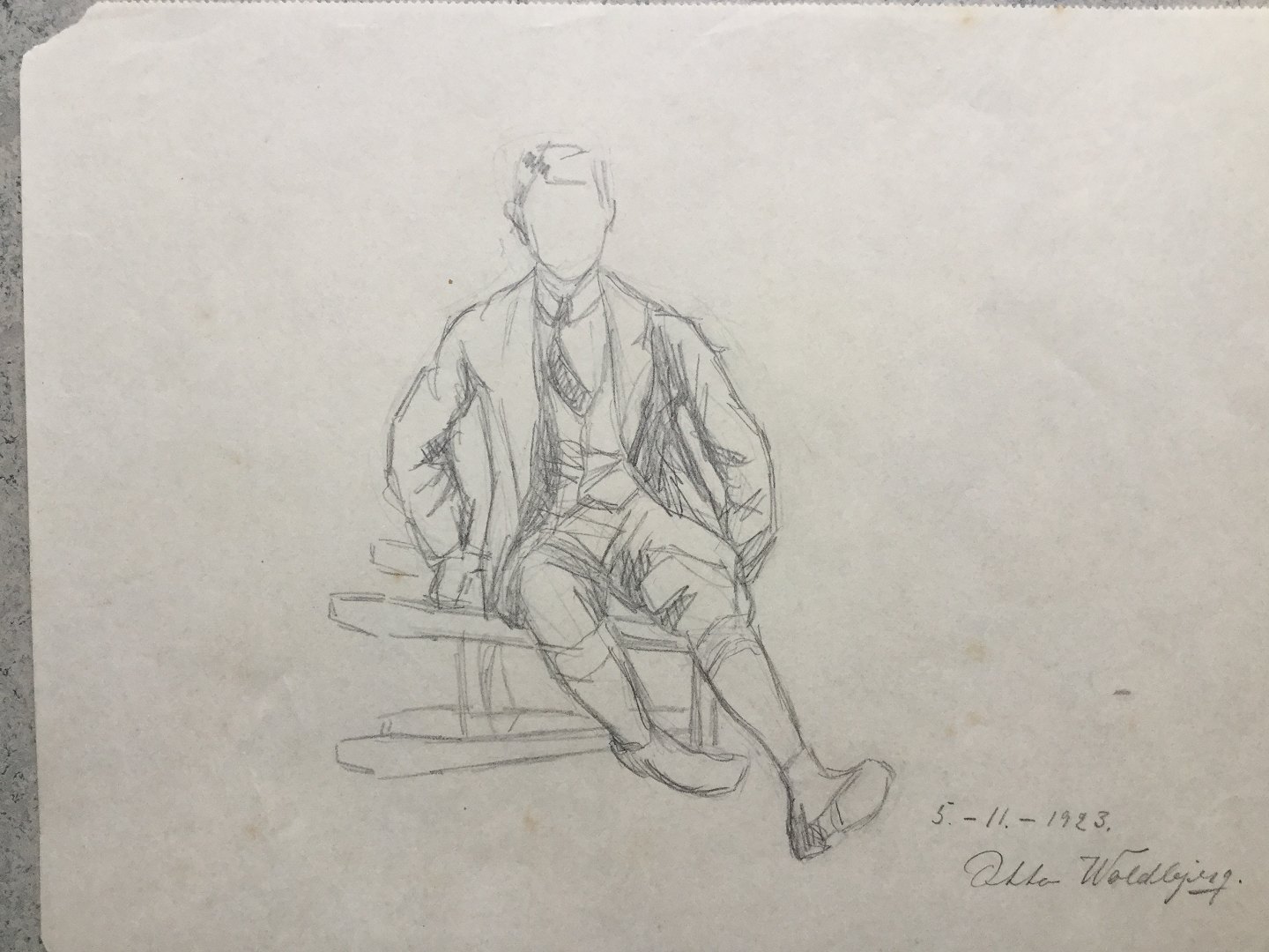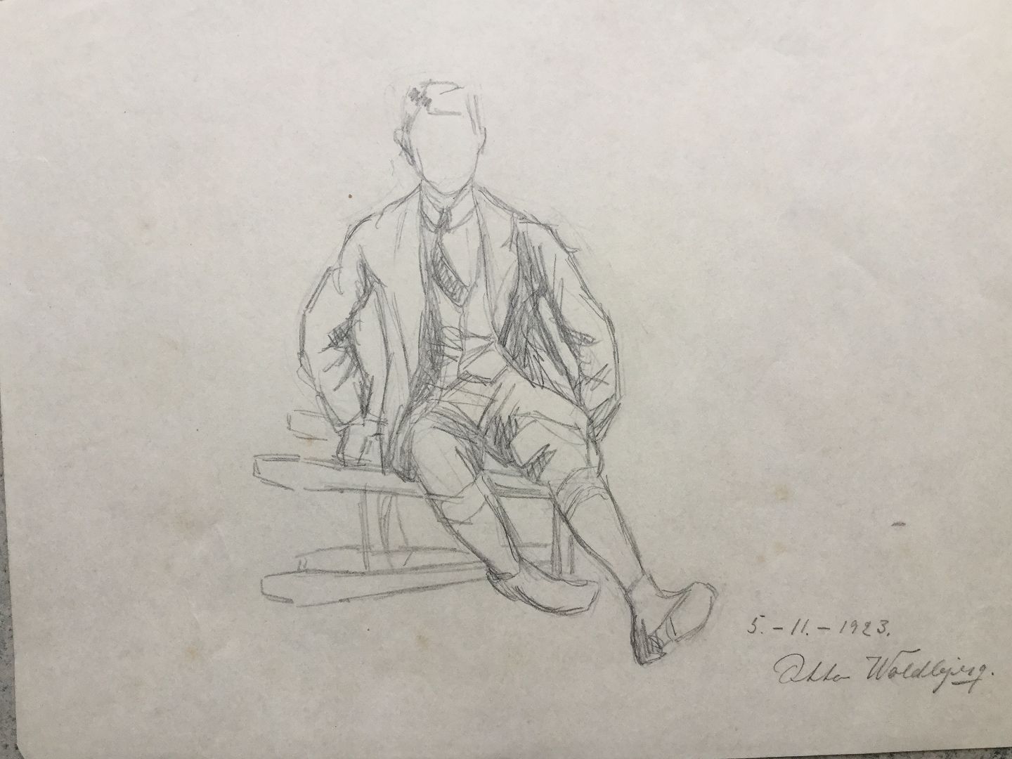 Tegning af Otto Woldbjerg Nielsen - Mand siddende på væltet taburet 1923.