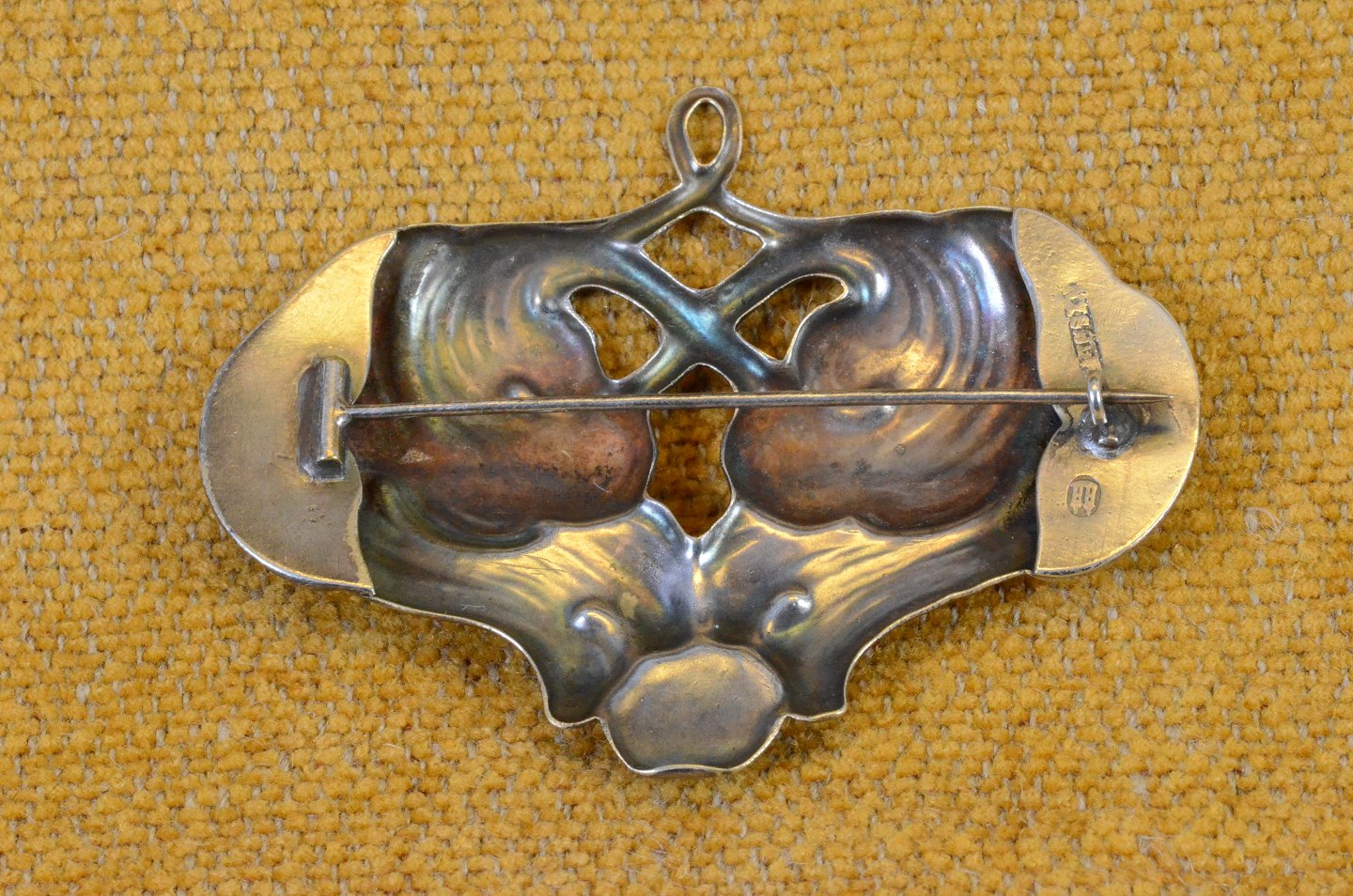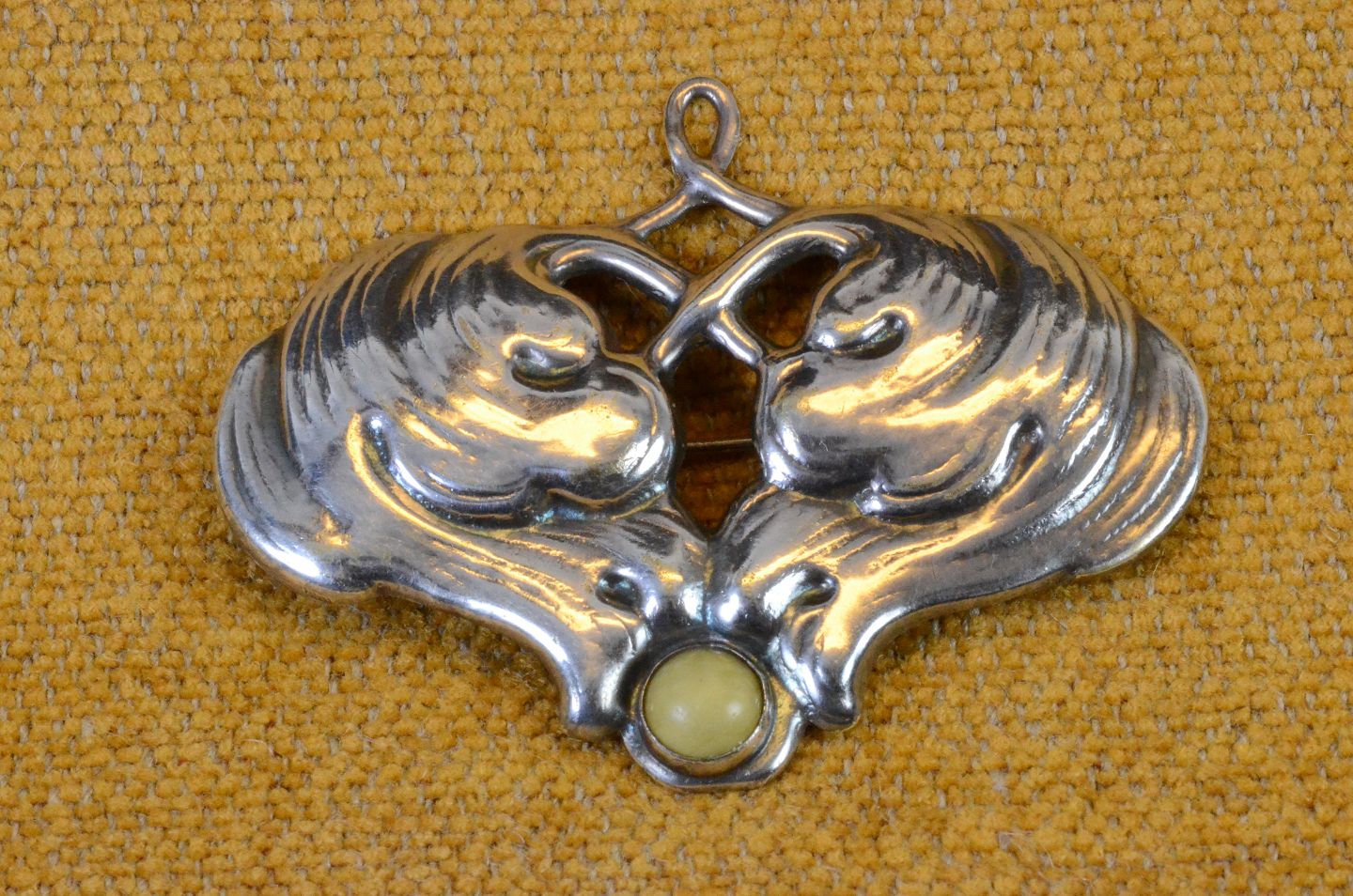 Brooch Art Nouveau in organic pattern and small pearl of amber. Stamped 2 towers = Copenhagen silver plate of fine quality. Art No. 8
