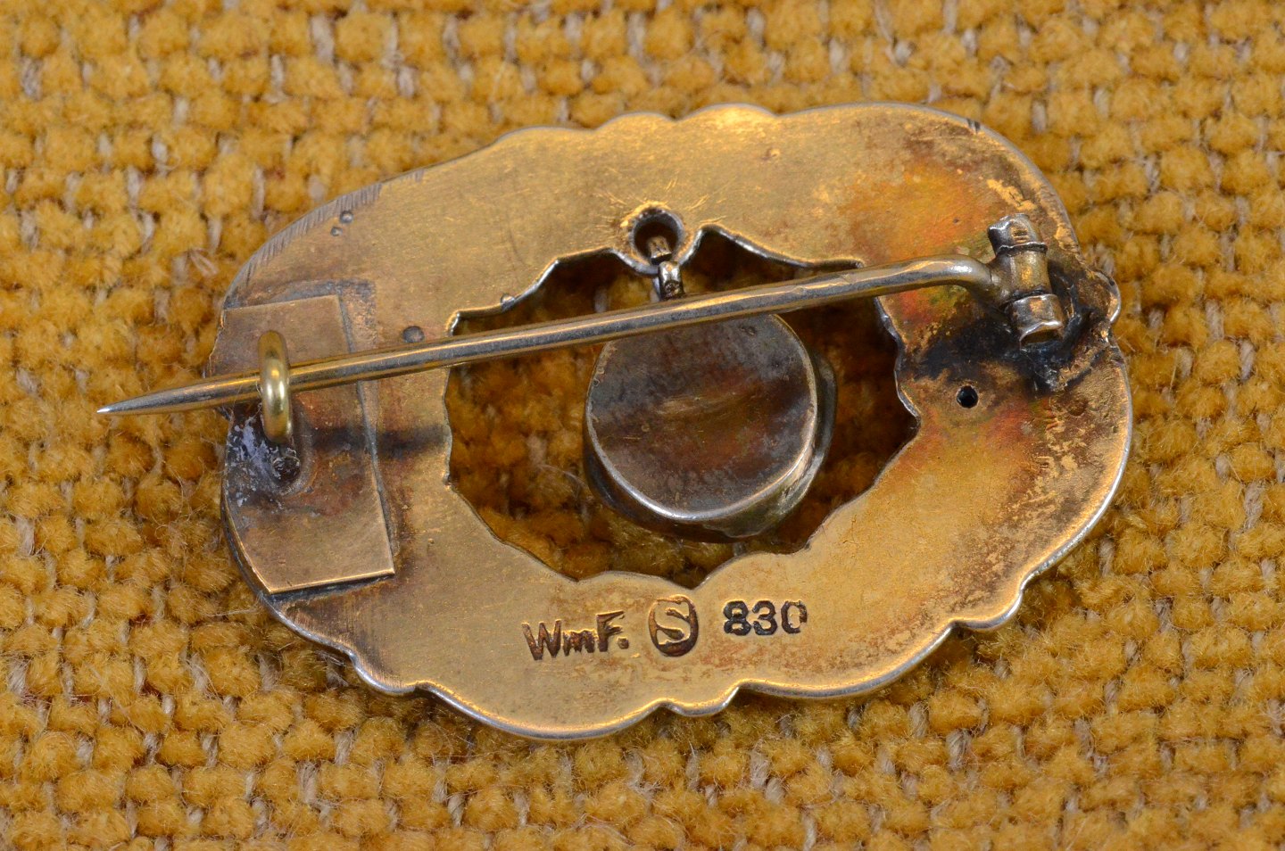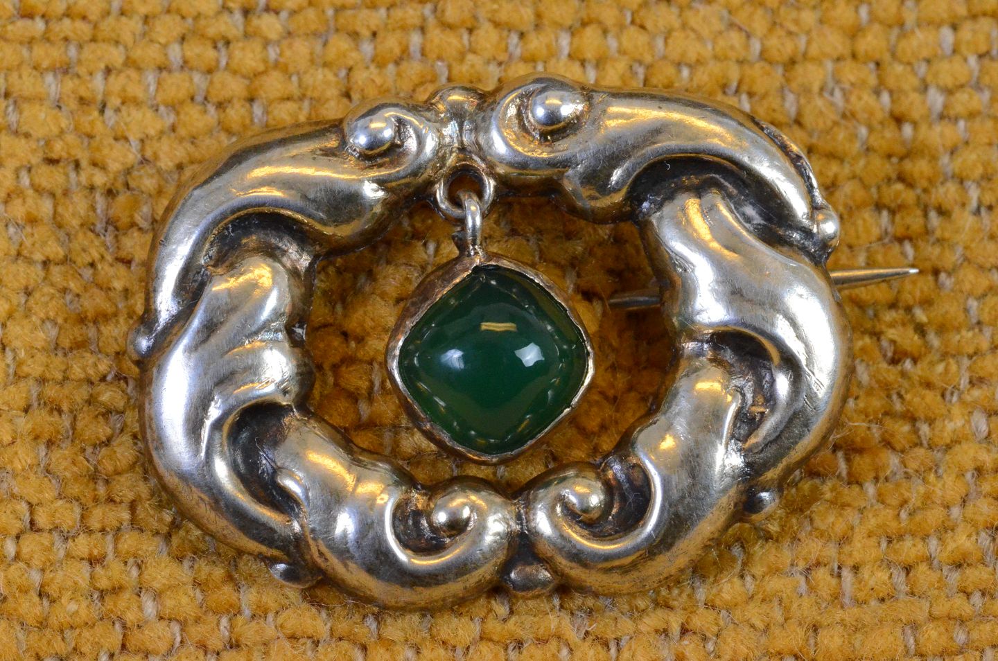 Broche William Fuglede skønvirke forgyldt sølv med grøn agat vedhæng. Stemplet WmF S 830.