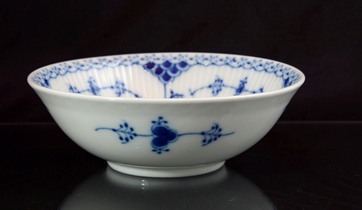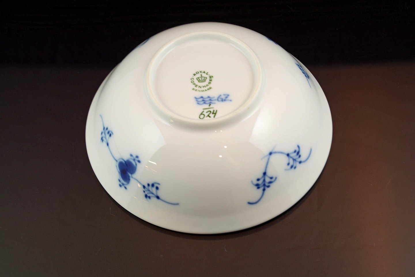 Kongelig skål (nr.1/624) i musselmalet halvblonde fra Royal Copenhagen. Intakt. 1. sort.