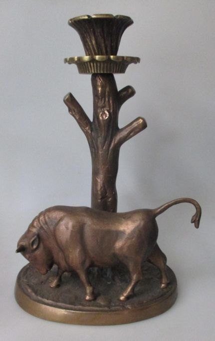 Par bronze stager, Danmark, ca. 1930. Dekoreret med tyre på oval fod ved træ stamme. Højde.: 28 cm.