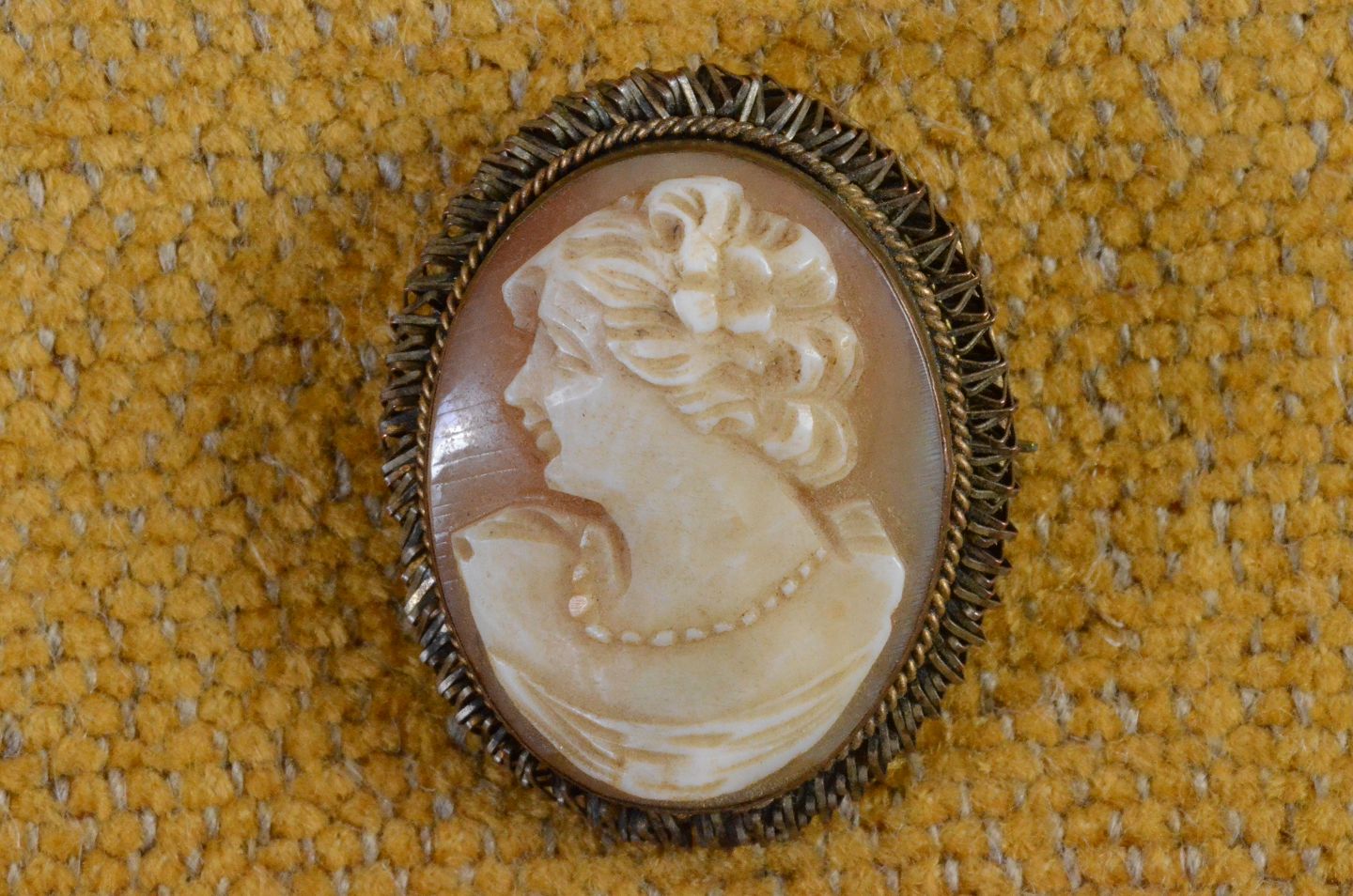 Camé dame med perlekrans skåret af konkylie, monteret i fint dekoreret sølvramme omgivet af snoet bånd. Camè som broche og vedhæng. Str.: 2,5*2,0 cm. Art No. 34