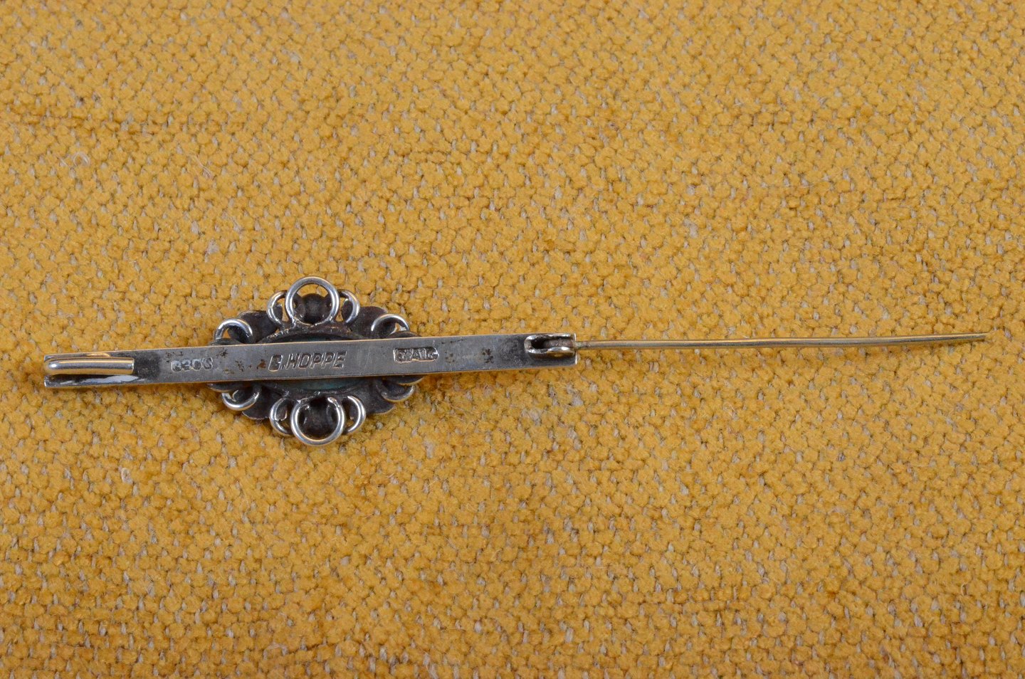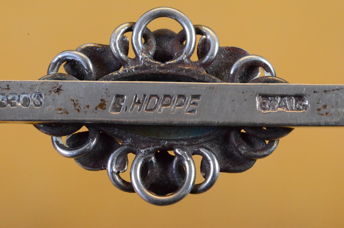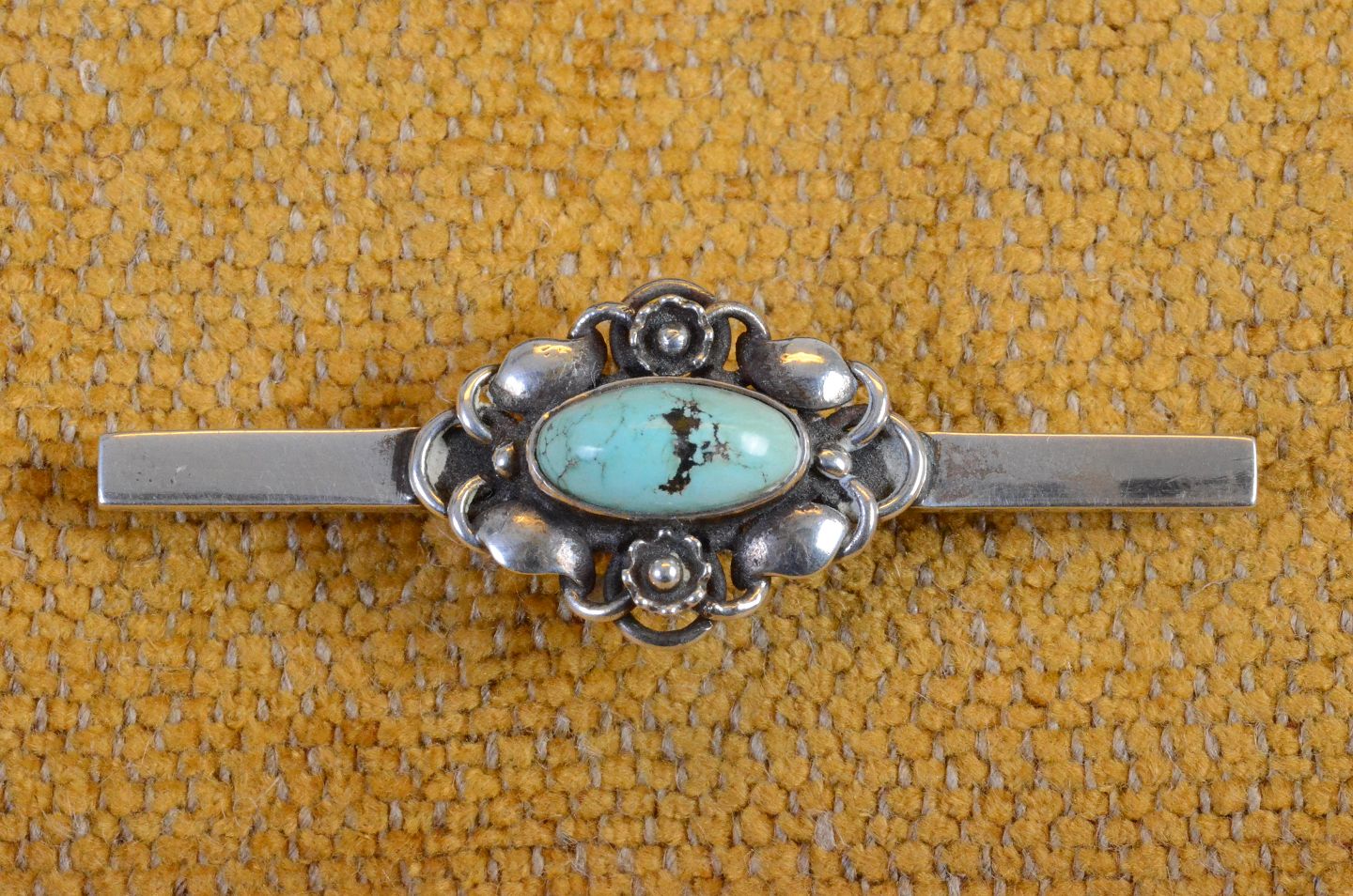 Brooch elongated decorated with cabochon cut turquoise mounted with silver flowers and leaves. Mark 836 S "G.Hoppe"Gottfred Henry Hoppe - Denmark 1943 - 1964. Str .: 6 cm Art No. 39