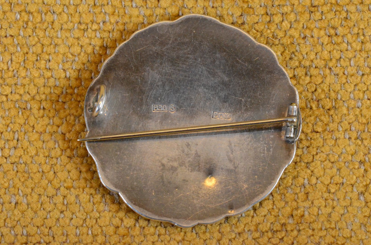 Broche Art Nouveau silver closed back, decorated with green agate. Stamped 830S "ECW". Diameter 4 cm. Art No .: 38