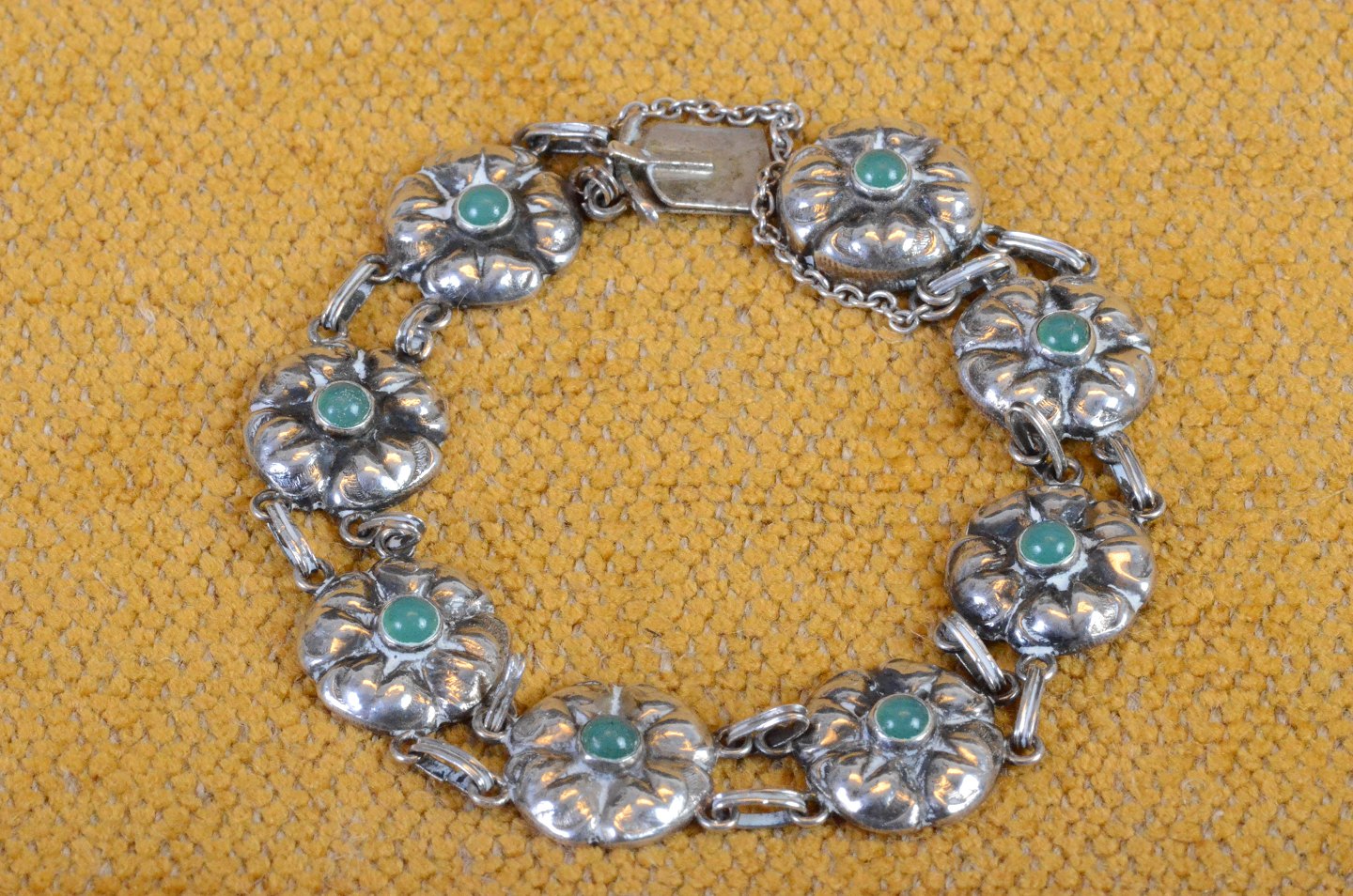 Bracelet art nouveau silver with closed back. Flowers made of in silver with center decoration by green agate. Str .: 21 cm. Art No. 41