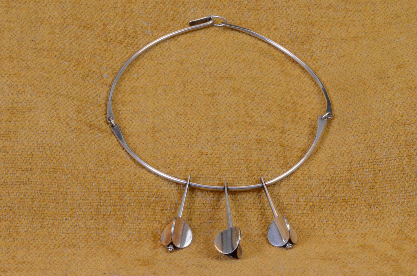 Neck ring in silver with 3 silver pendant designed as beechnut on stems. Hallmark 925 A. Michelsen. Diameter 11 cm. Art No. 54