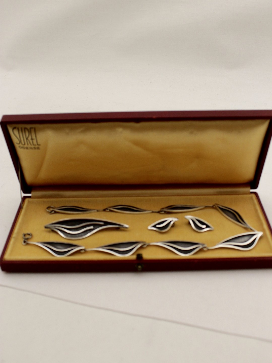Sølvsmed Rudolf Andresen Aabenraa smykkesæt sterling sølv bestående af halskæde 39 cm. broche 6,8 cm. øreclips 2,5 cm. Nr. 284673