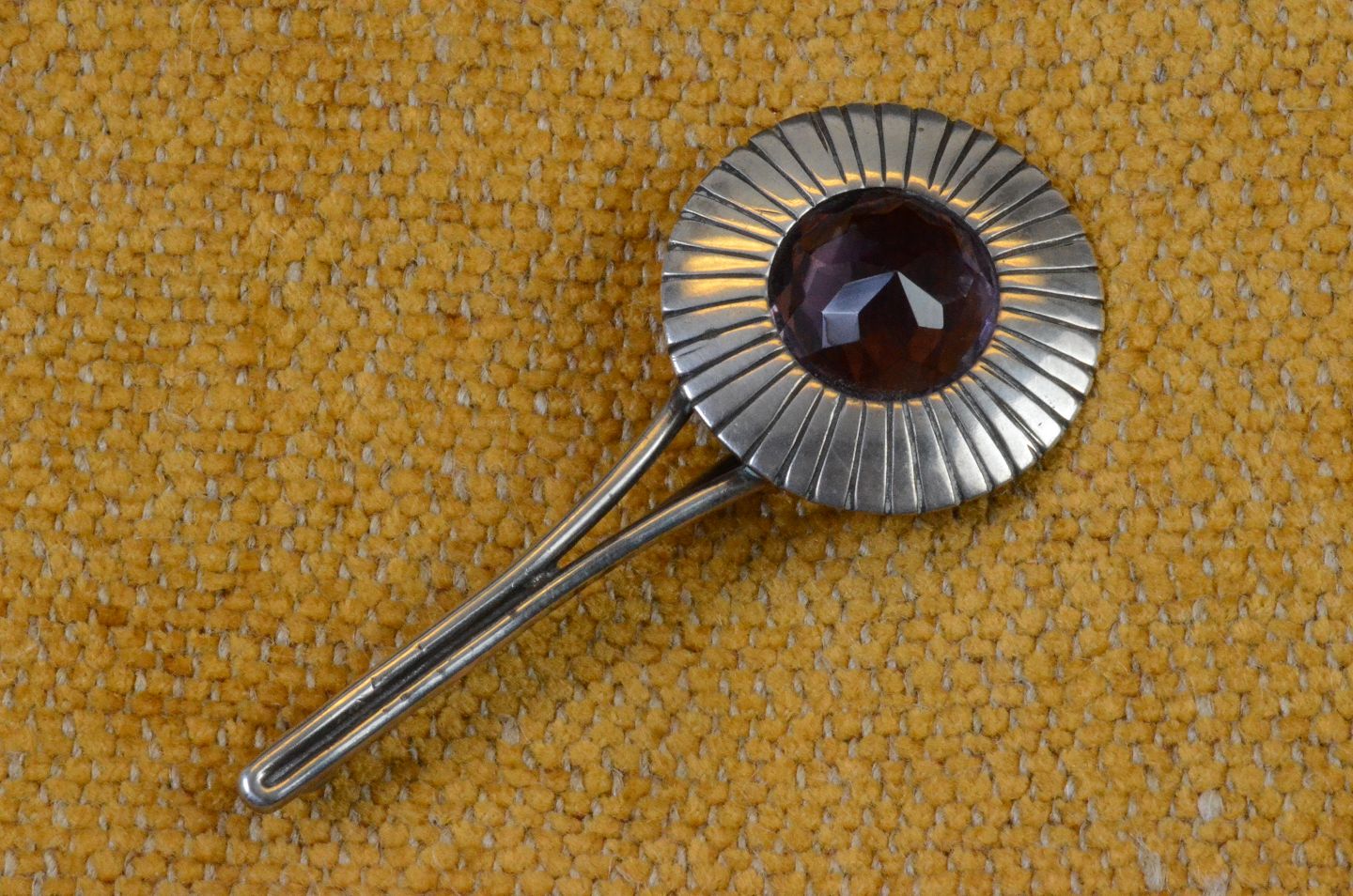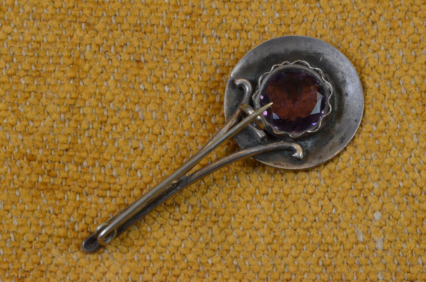 Broche i sølv formet som morgenfrue med ametyst midte. Ustemplet men er utvivlsomt af sølv. Str.: 6*2,5 cm. Art No. 62