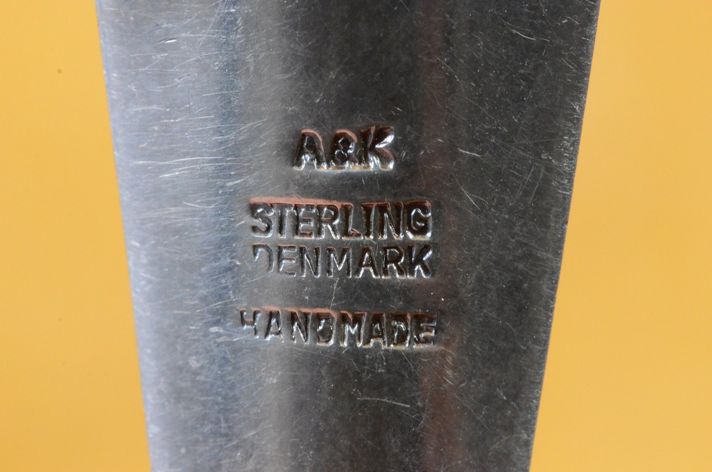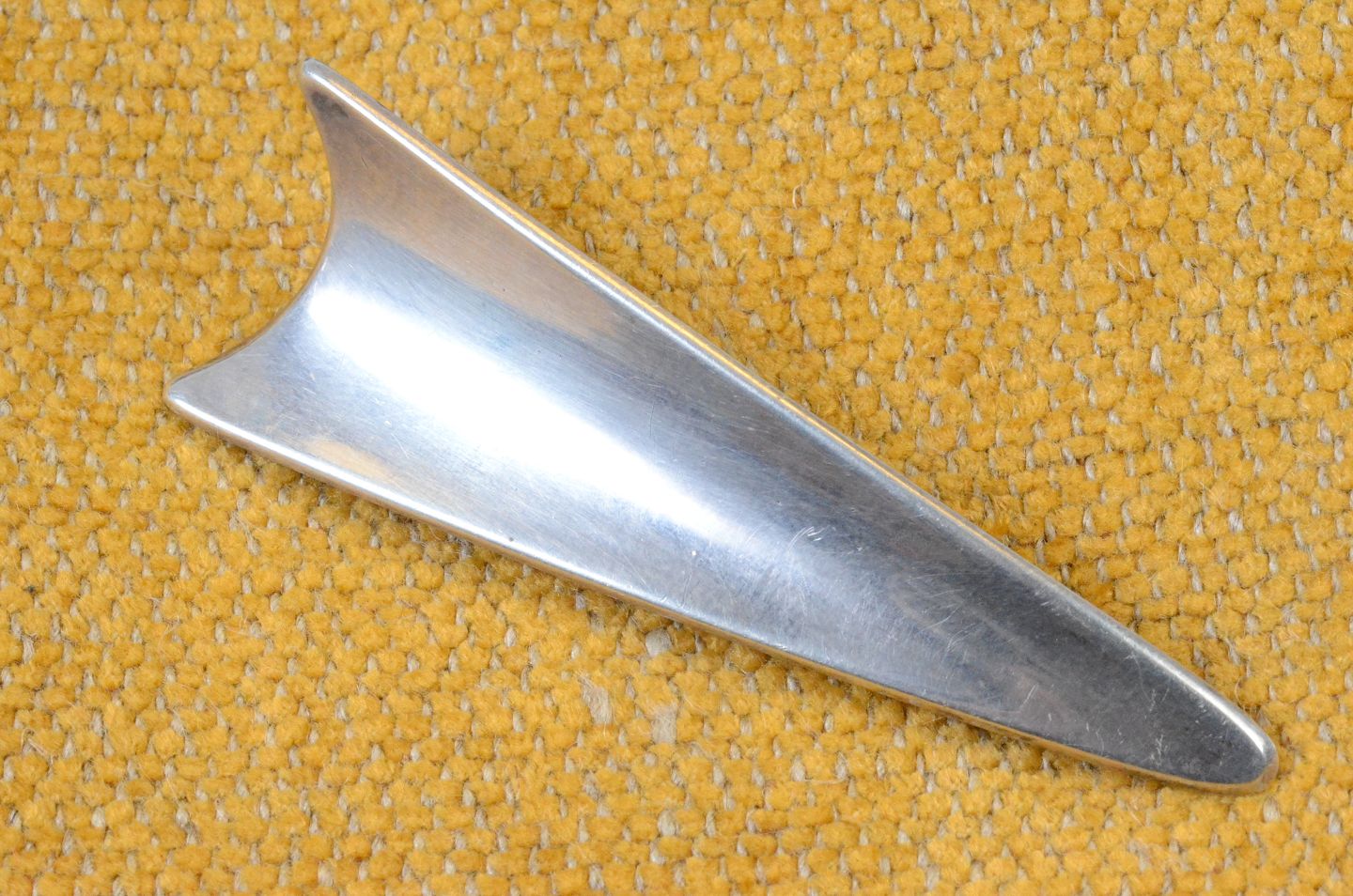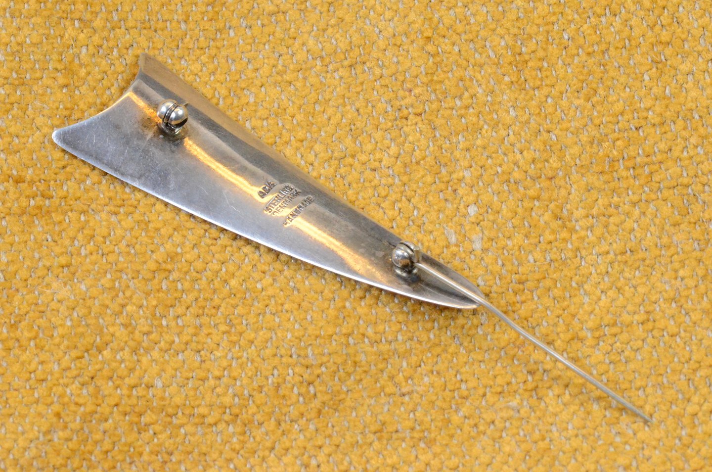 Broche af sølv pileformet blad. Stemplet A&K Sterling Denmark Handmade. Aarre & Krogs eftf. Randers 1949-90. Str.: 7*2 cm. Art No. 64
