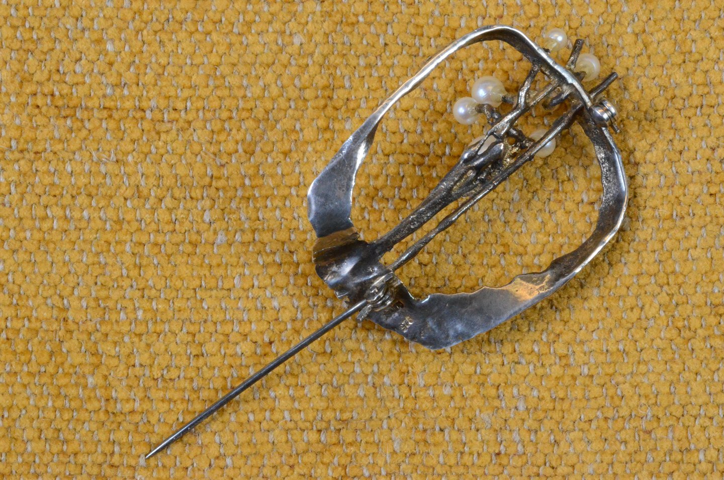 Broche af sølv kunstfærdigt udformet, hammerslået, skåret og dekoreret med 9 perler f forskellige størrelser. Stemplet 925 Conar. Conar v/F. Hamburger - Klampenborg 1968 - 1990. Str.: 5*3 cm. Art No. 68