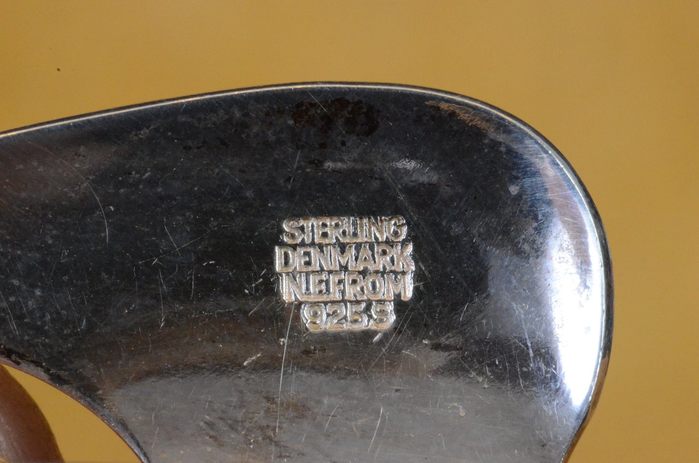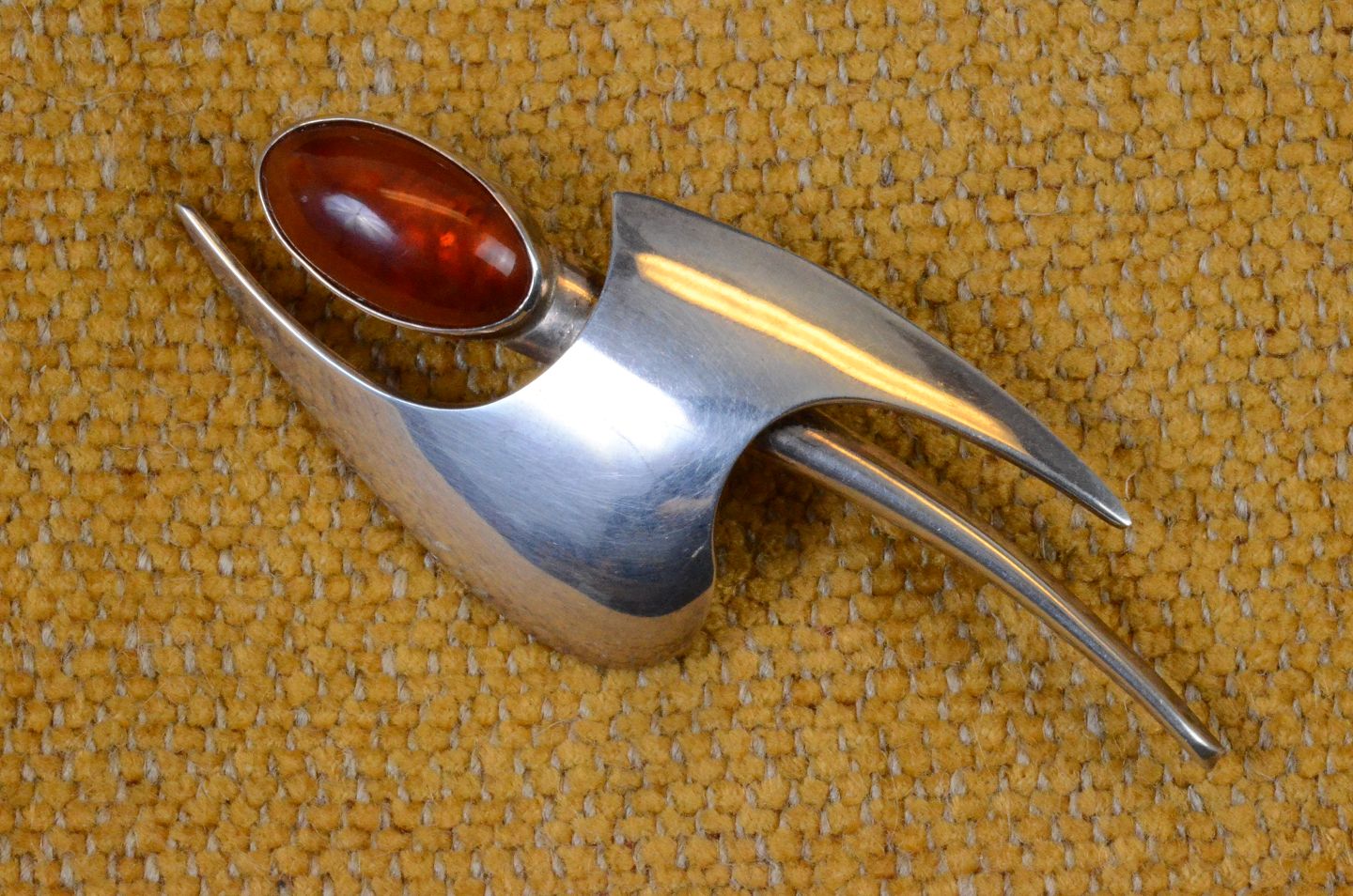 Broche af sølv formet som skematisk engel med hoved af rav. Stemplet N.E.From Sterling Denmark. Str.: 7*2,5cm. Art No.72