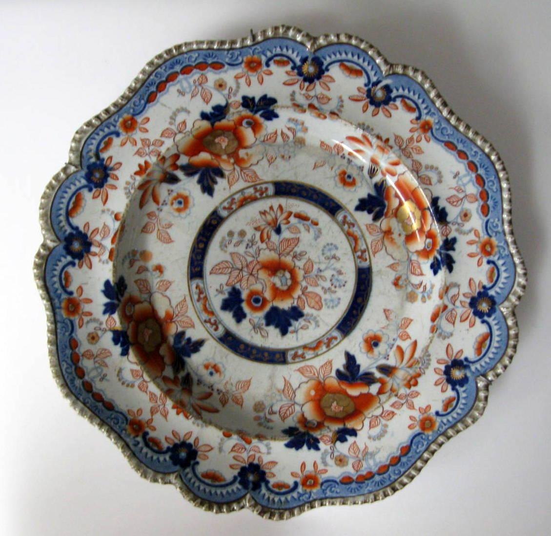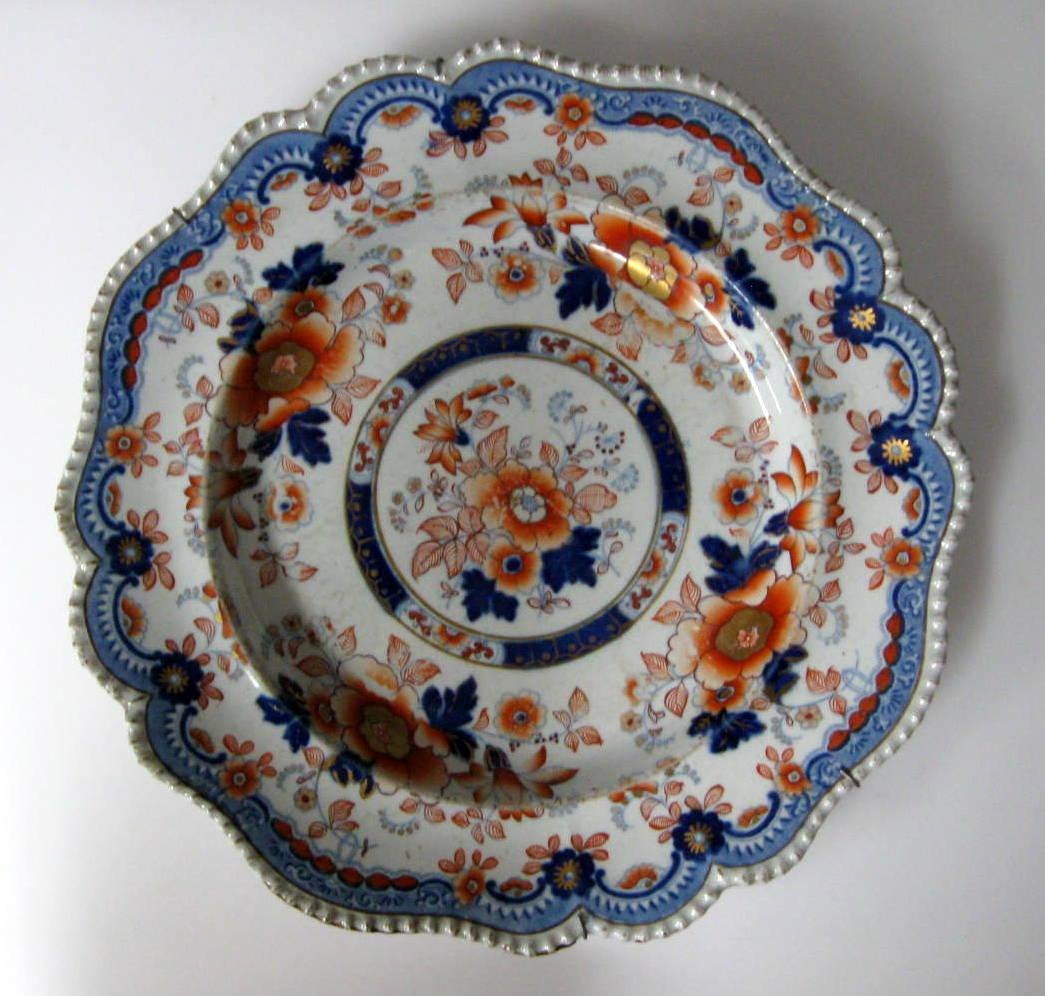 Et par engelske tallerkener, 1851 - 1854, Mason, Stone China. Dekoreret i overføringsteknik med blomster i blåt, orange og med forgyldninger. Riflet fane. Stemplet. Stone China 69. Et par! Pris pr. stk.