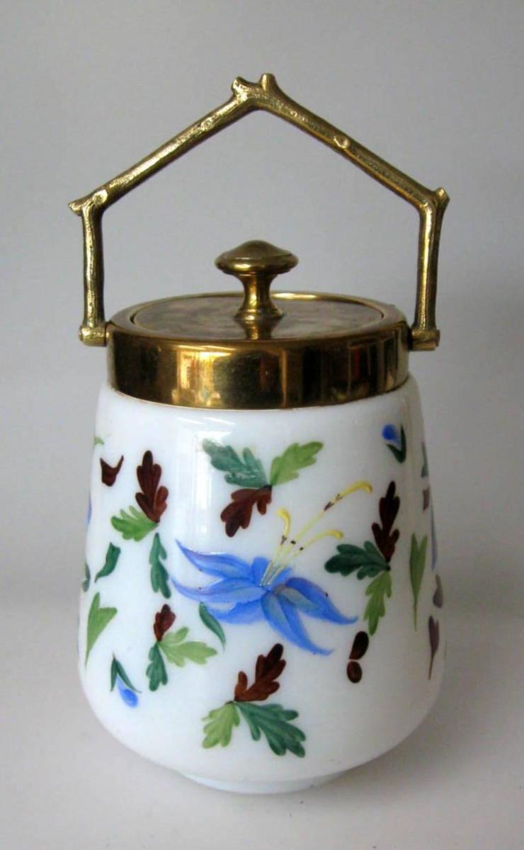 Kiksespand i opaline glas med emalje dekorationer, o. 1900. Dekoreret med forårs blomster. Med hank og låg i messing. Højde.: 11,5 cm. Højde til hank: 17,5 cm. Antagelig dansk arbejde.