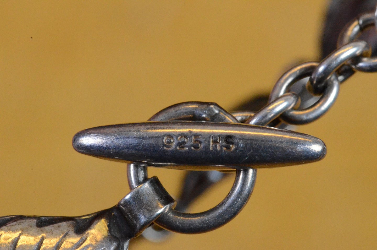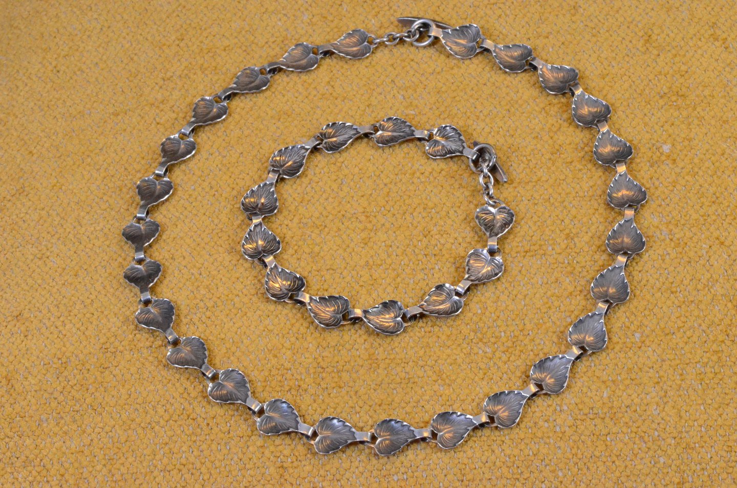 Collier halskæde og armbånd sølv. Collier og armbånd består af små fine savtakkede blade leddelt. Kan samles til en længere kæde. Stemplet 925 HS. Hermann Siersbøl. Str.: collier 40 cm, armbånd 19 cm. Art No. 83
