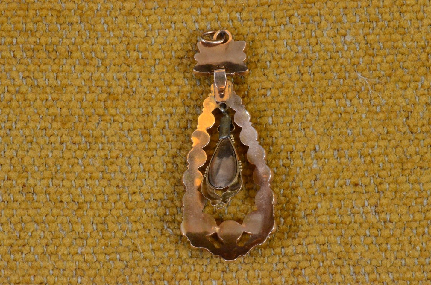 Granat vedhæng af lille blomst med øsken i bunden, herpå hægtet dråbeformet vedhæng med løsthængende center af stor flot granat. Forgyldt sølv dekoreret med bladmotiver. Art. No. 91