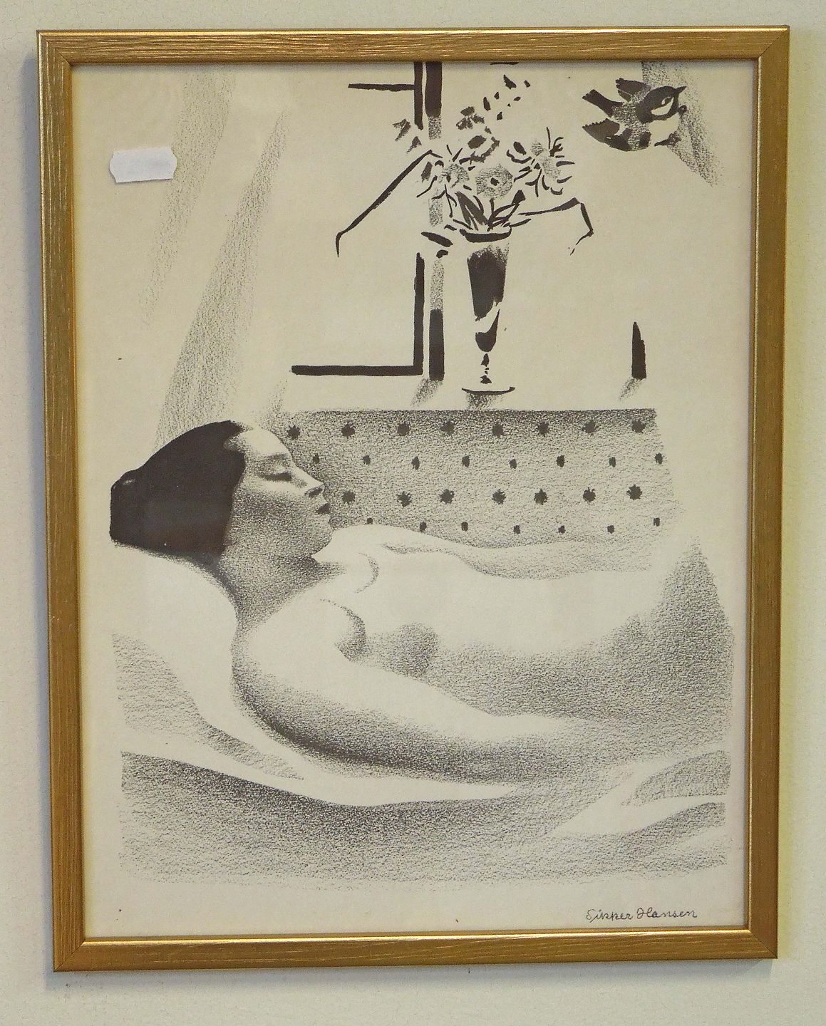 Indrammet tryk af Sikker Hansen med motiv af af liggende kvinde