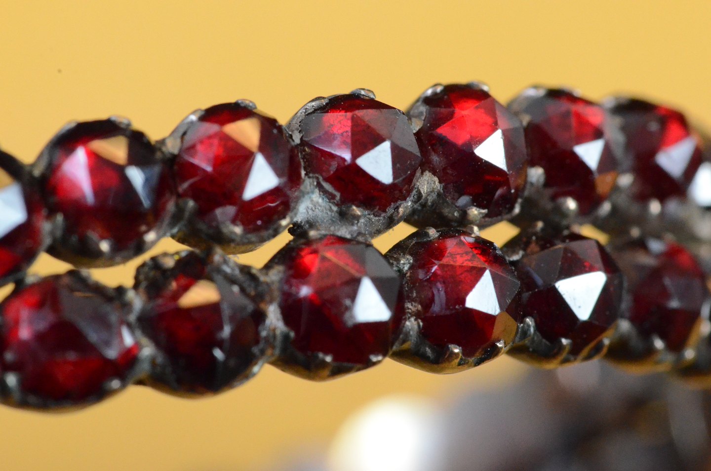Antikt bøhmisk granat armring bestående af to række rosen facetslebne granater. Armbåndet er hængslet på den ene side og har et spænde på den anden med den oprindelige sikkerhedskæde. Forgyldt sølv. Størrelse: oval 5 * 6 cm. Art nr 106
