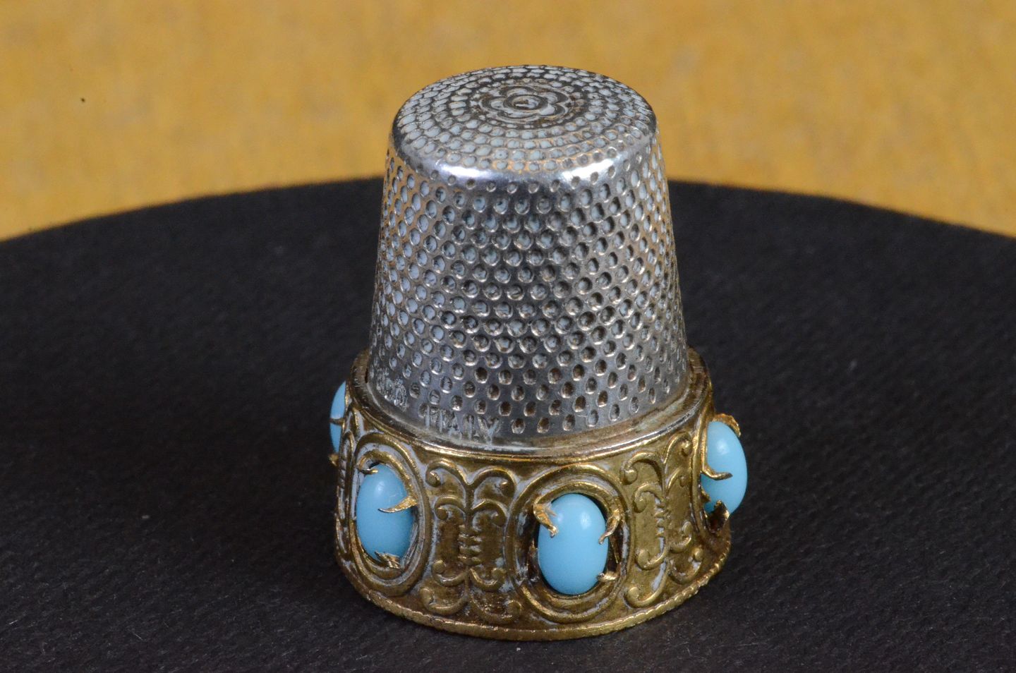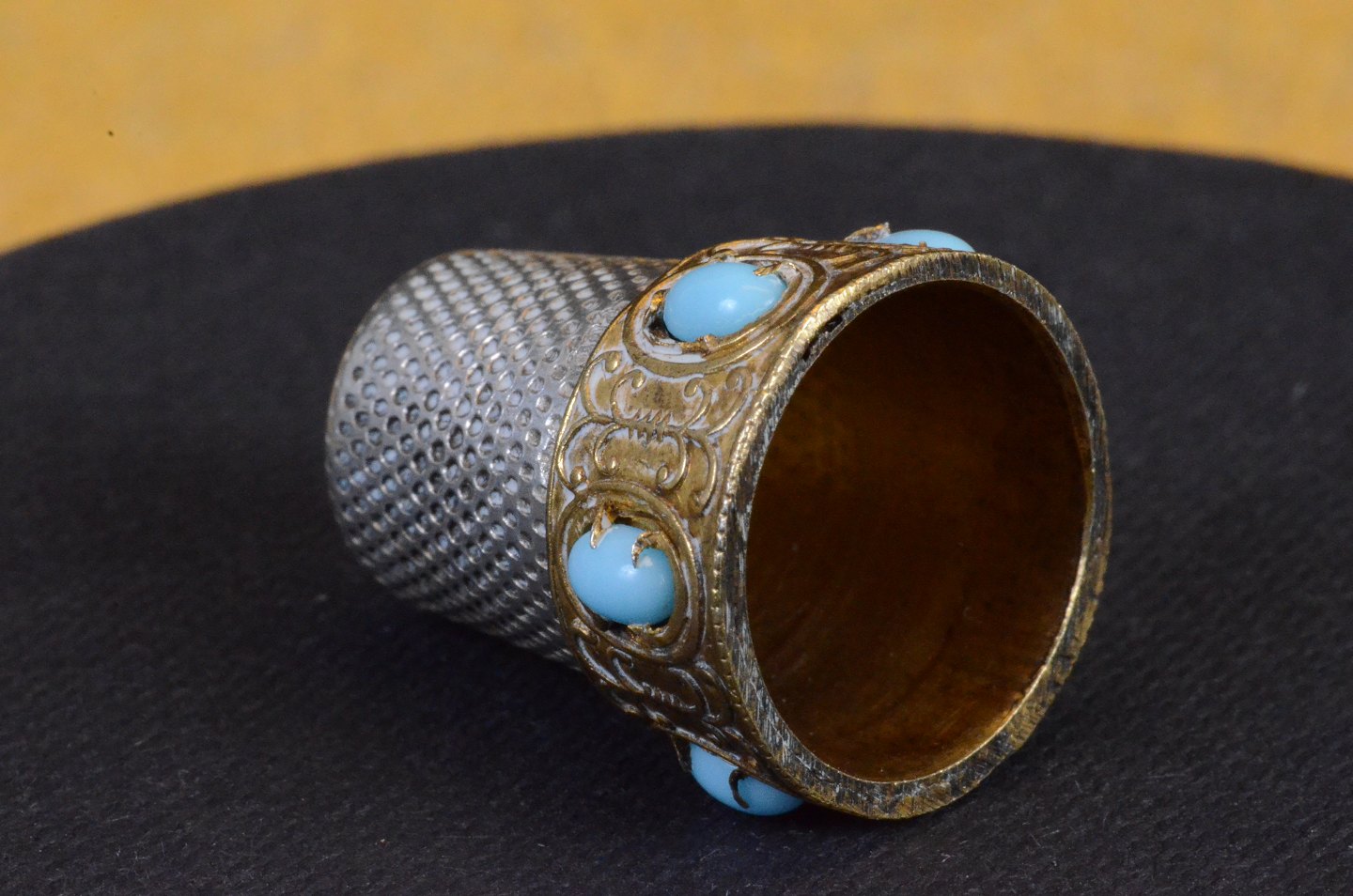 Fingerbøl i sølv dekoreret med forgyldning og tyrkiser. Stemplet 800 S. art. No. 116