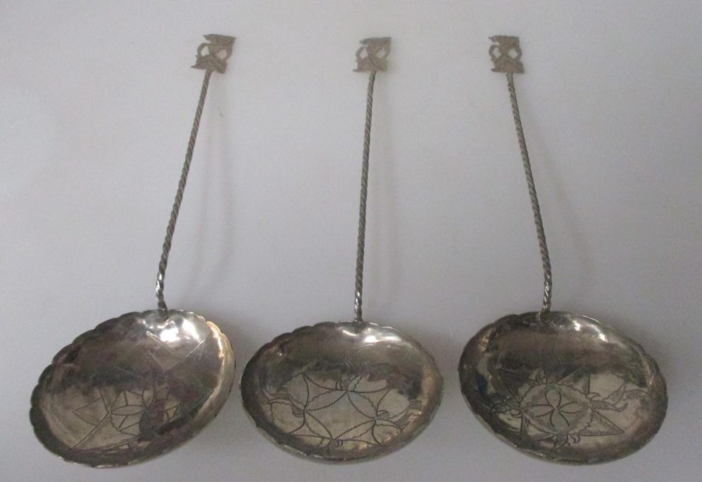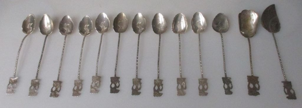 Stor samling Indonesiske for sølvet bestik - til ris taffel, 19. årh. Bestående af 3 stor potageskeer, 6 lange skeer, 11 mindre skeer og 2 diverse. Sælges kun samlet.