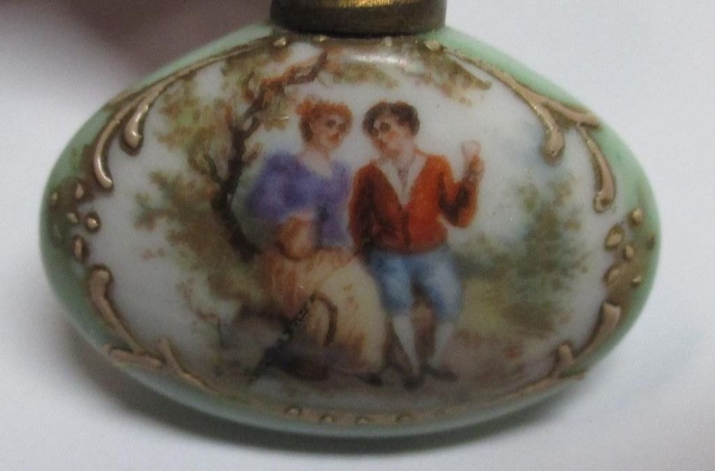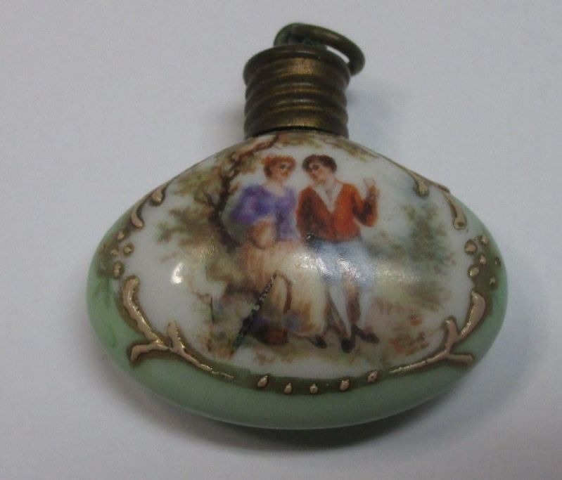 Parfumeflacon in hand-painted porcelain. Germany, 19th century. Decorated with pastoral scene. With brass lid and eyelet. 3.3 x 3.5 cm.