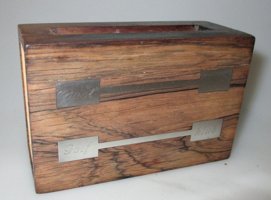 Hans Hansen, Kolding, Danmark, tændstik holder, 20. årh. Med indlagt sterling sølv. Tekst: Vest - jysk Golf Klub. 10,5 x 7 x 4,2 cm. Palisander.
