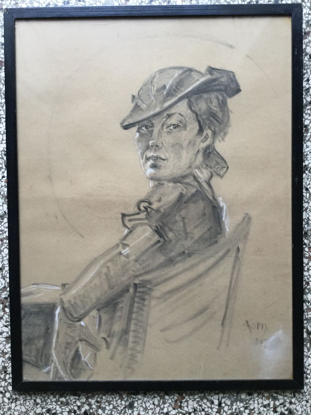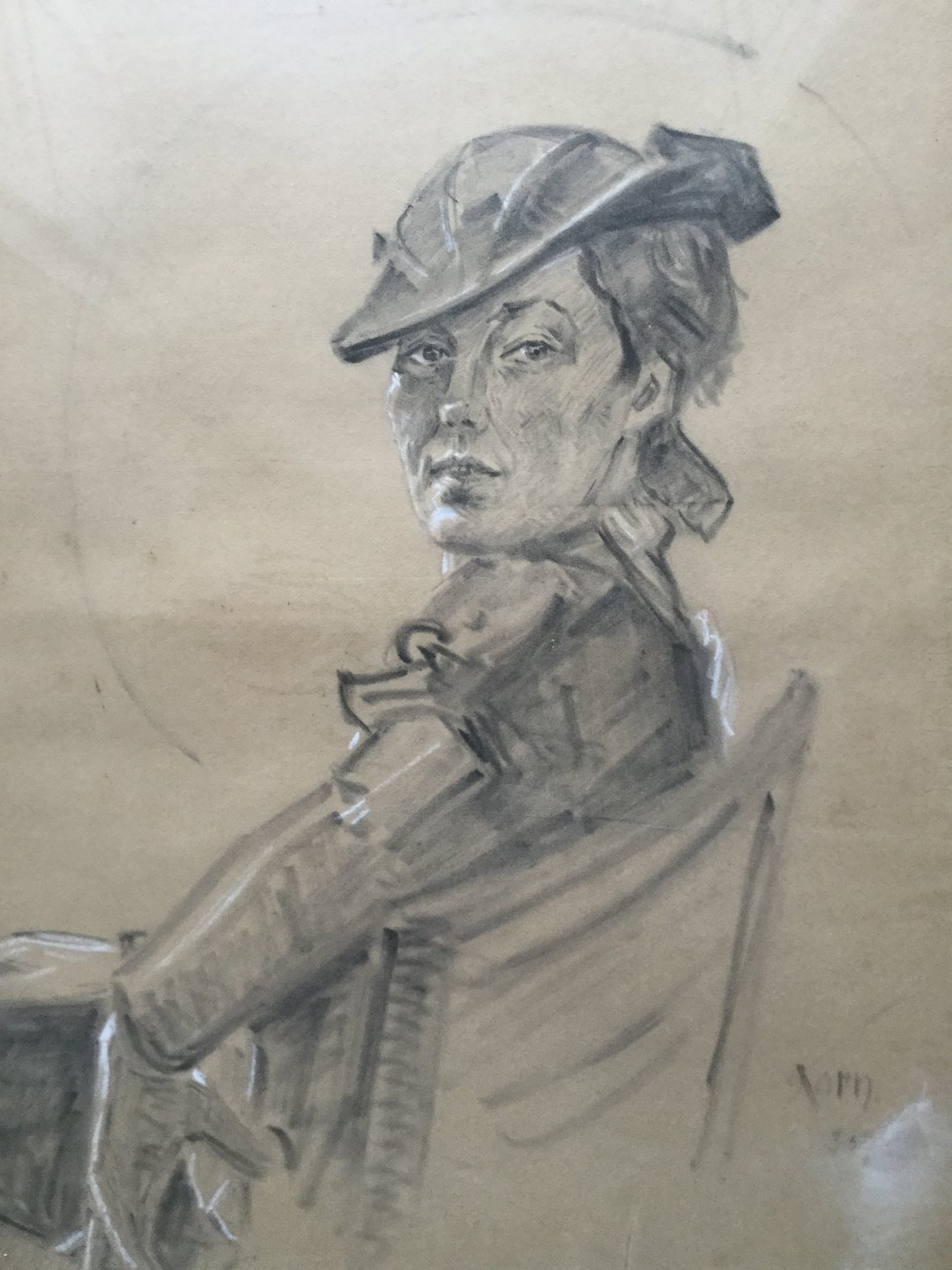 Tegning af H.J. Korn 1935 - Siddende kvinde i ridedress.