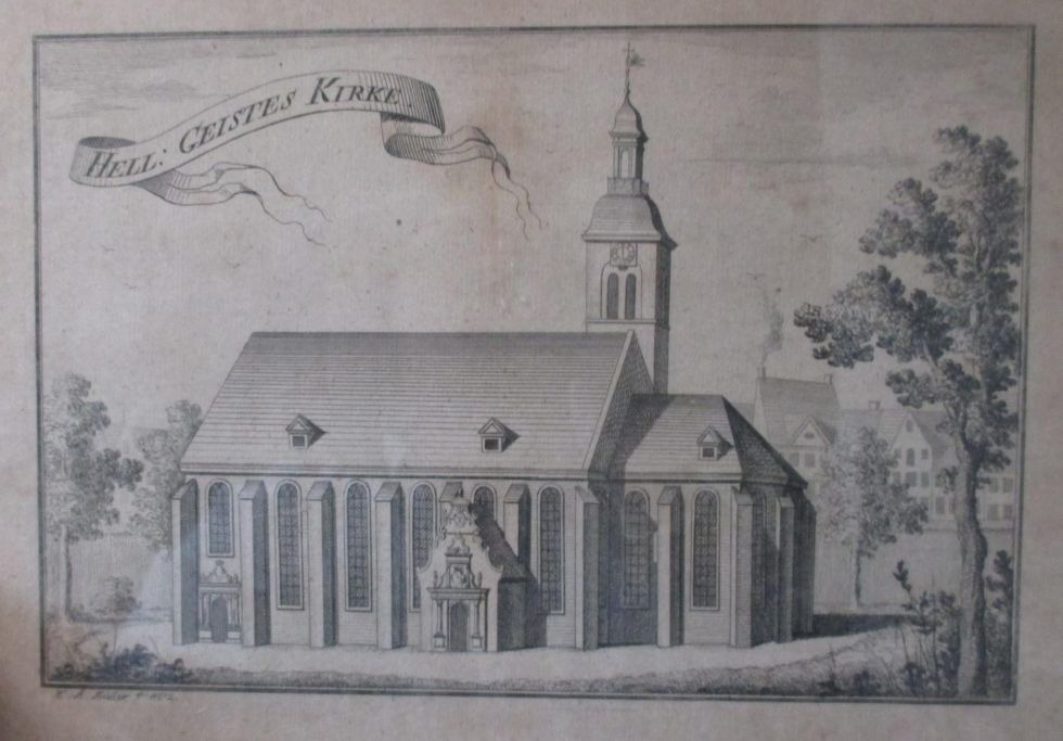 Topografisk kobberstik, Hellig Geistes Kirke, København, 1761. Stukket af W. A. Müller. 16 x 24 cm.