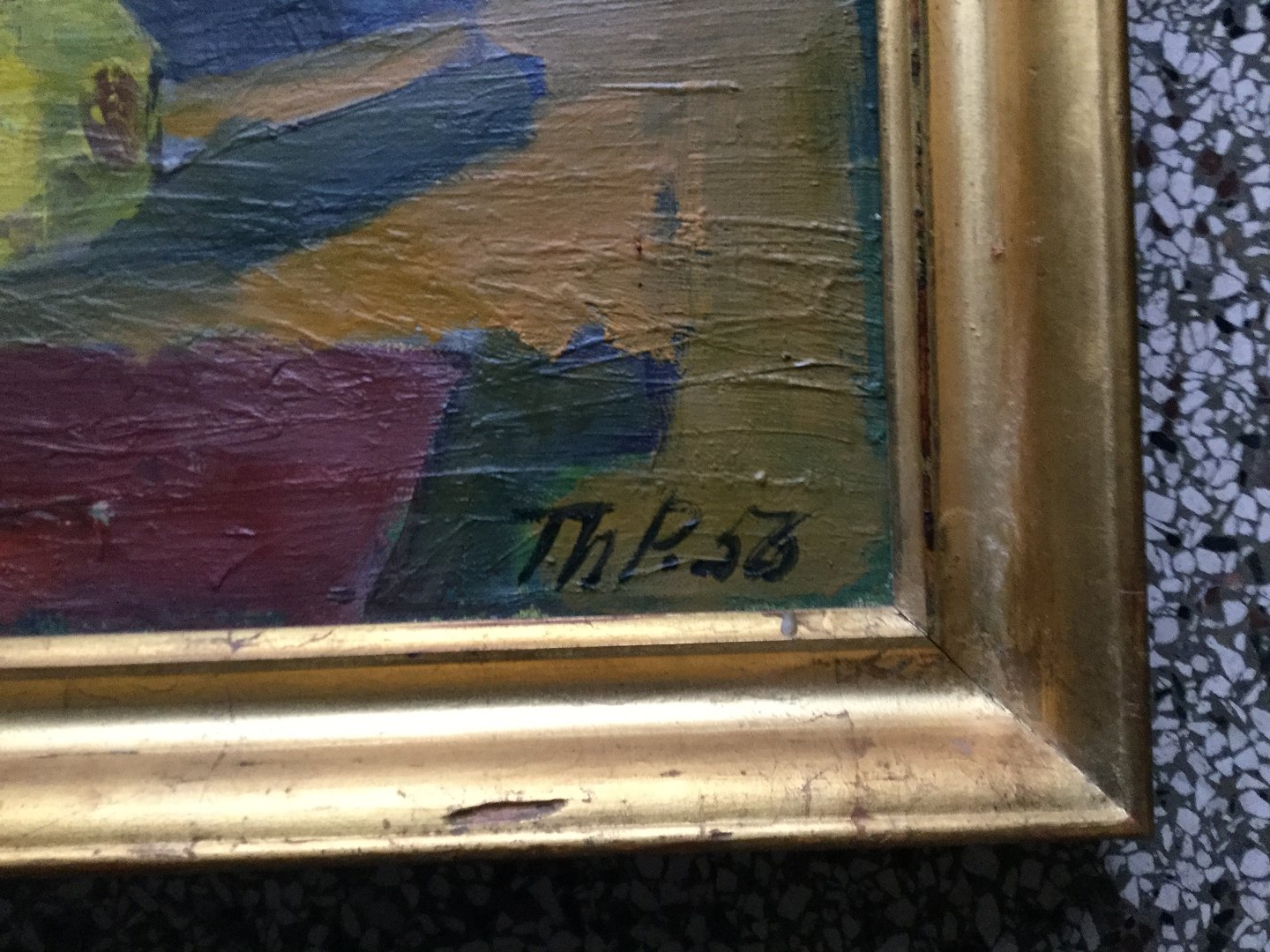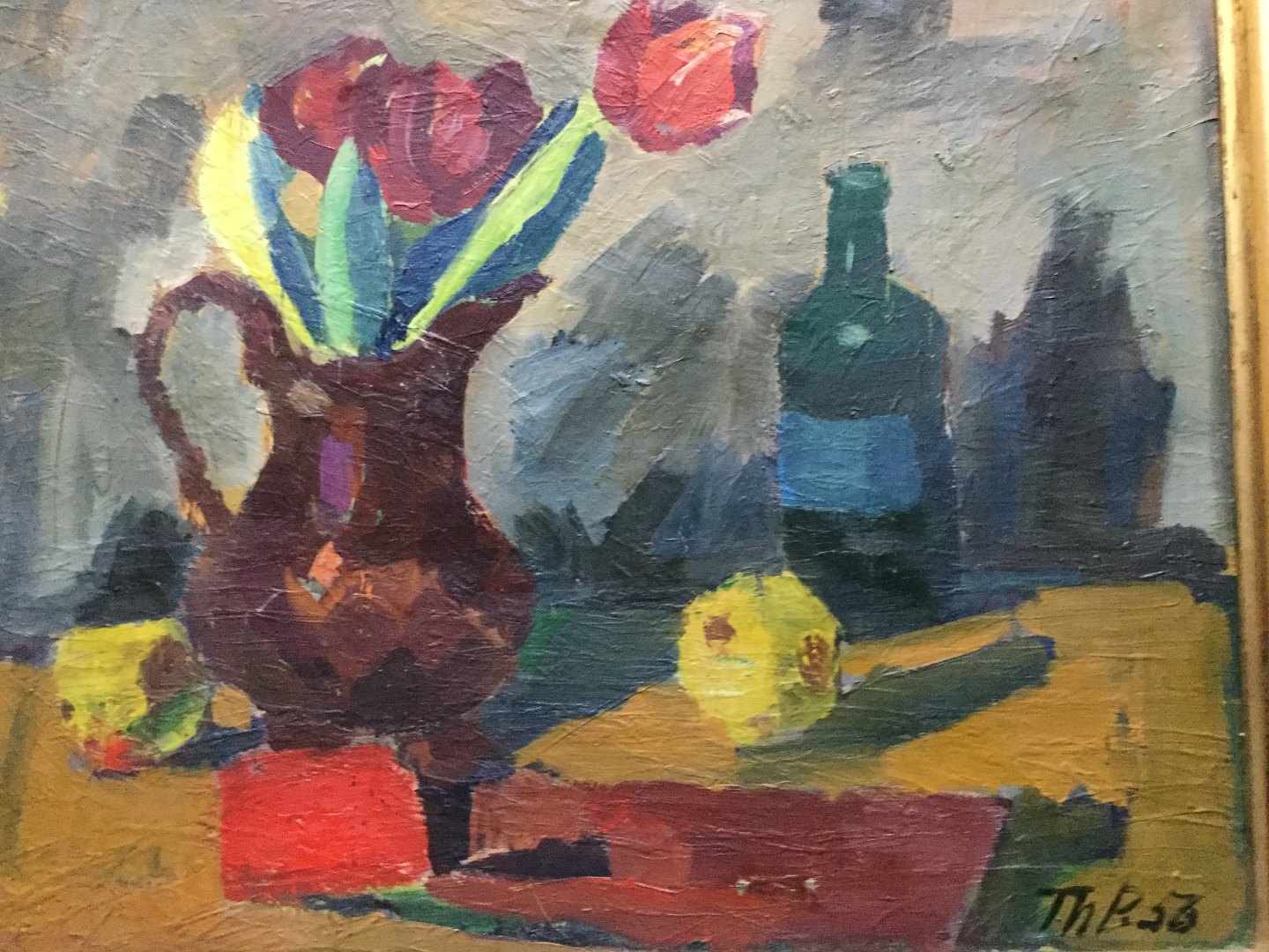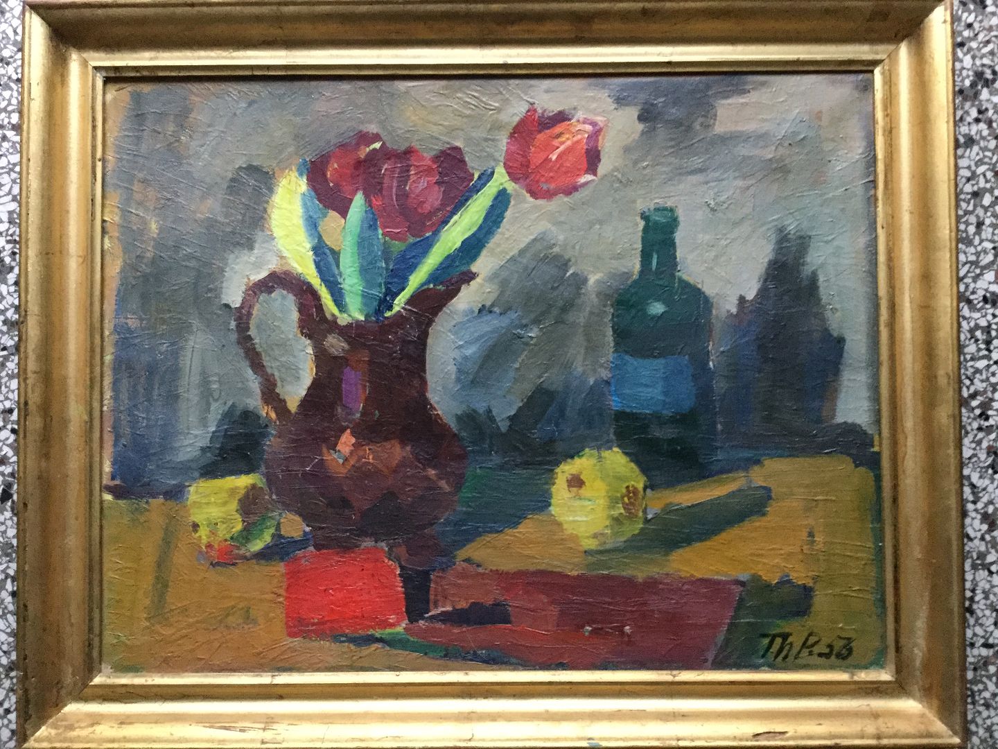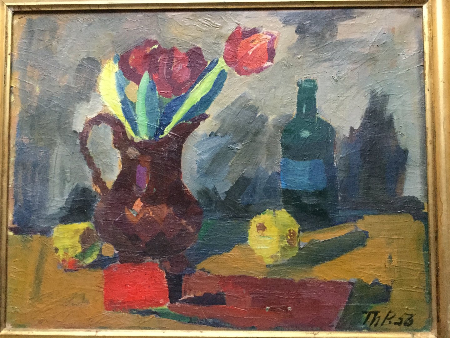 Maleri af Thorvald Petersen 1956 - Kande med tulipaner, flaske og frugt på bord.