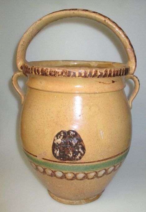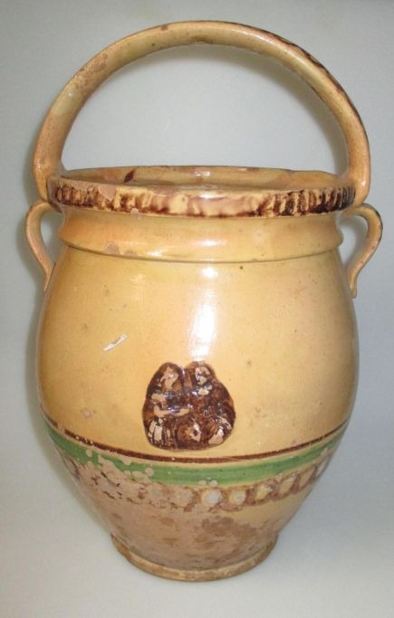 Sorring barsels potte, ca. 1860 - 1870. Sorring ved Silkeborg, Danmark. Med varm gul begitning. Dekoreret med cirkler og linier i grønt, hvidt og brunt. Med rødbrune relieffer af mor og ung pige. Påsat indefra. Højde med hank: 31 cm.