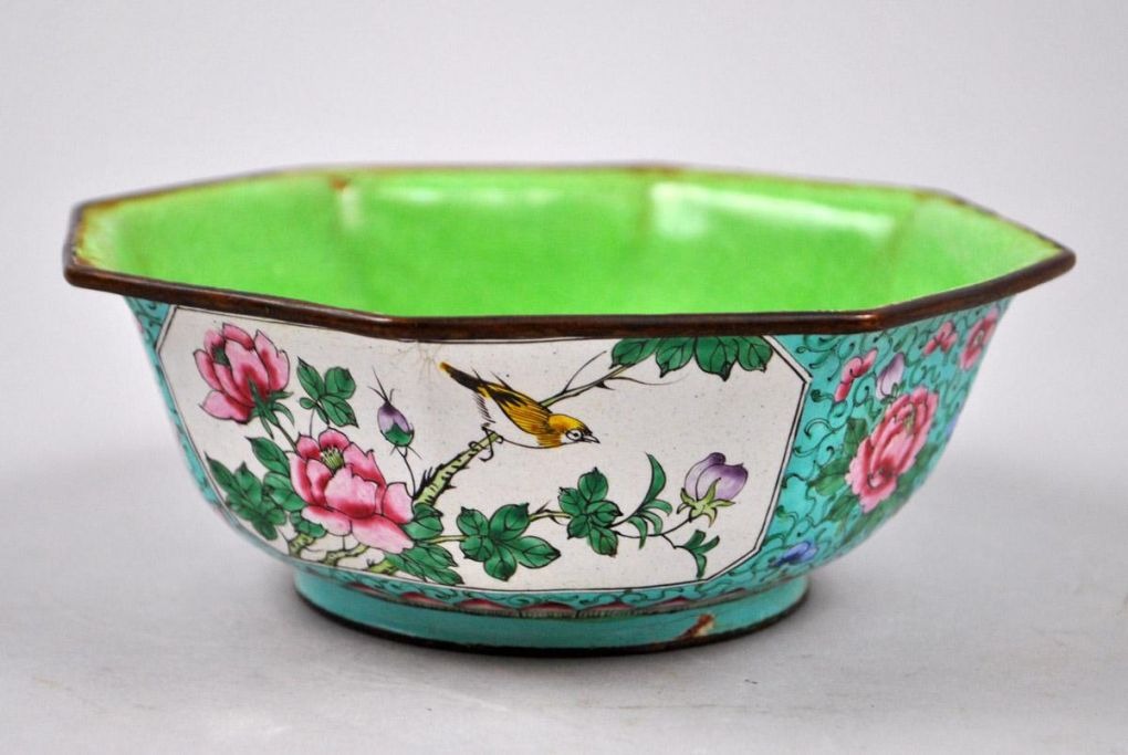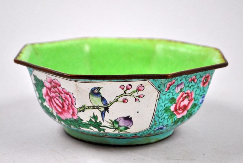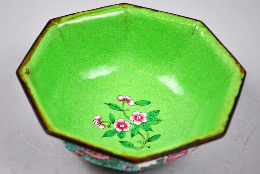 Emaljedekoreret oktagonformet skål i kobber, Canton, 19. årh. Kina. Dekoreret med fugle og blomster. På en lille rund kant. H.: 5,5 cm. Dia.: 14,5 cm. Med mindre afslag!