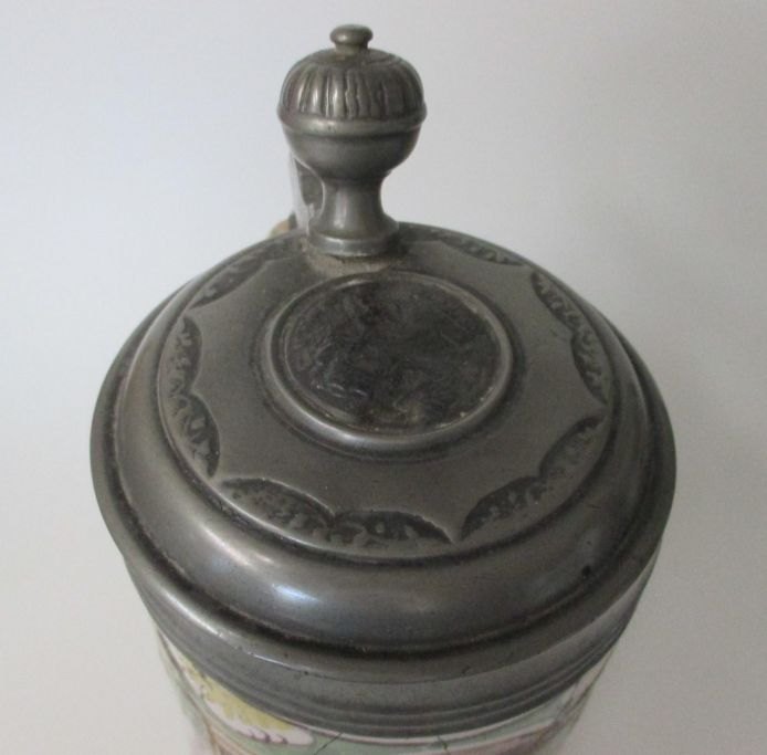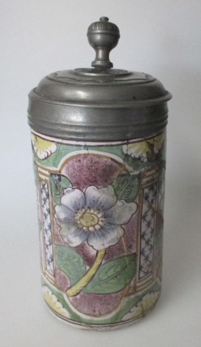 Tysk signeret fajance øl krus, 18. årh. Med tin låg.