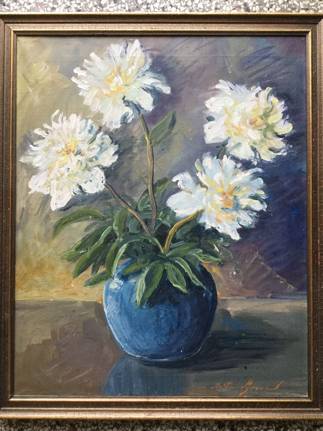 Blå vase med hvide pæoner.