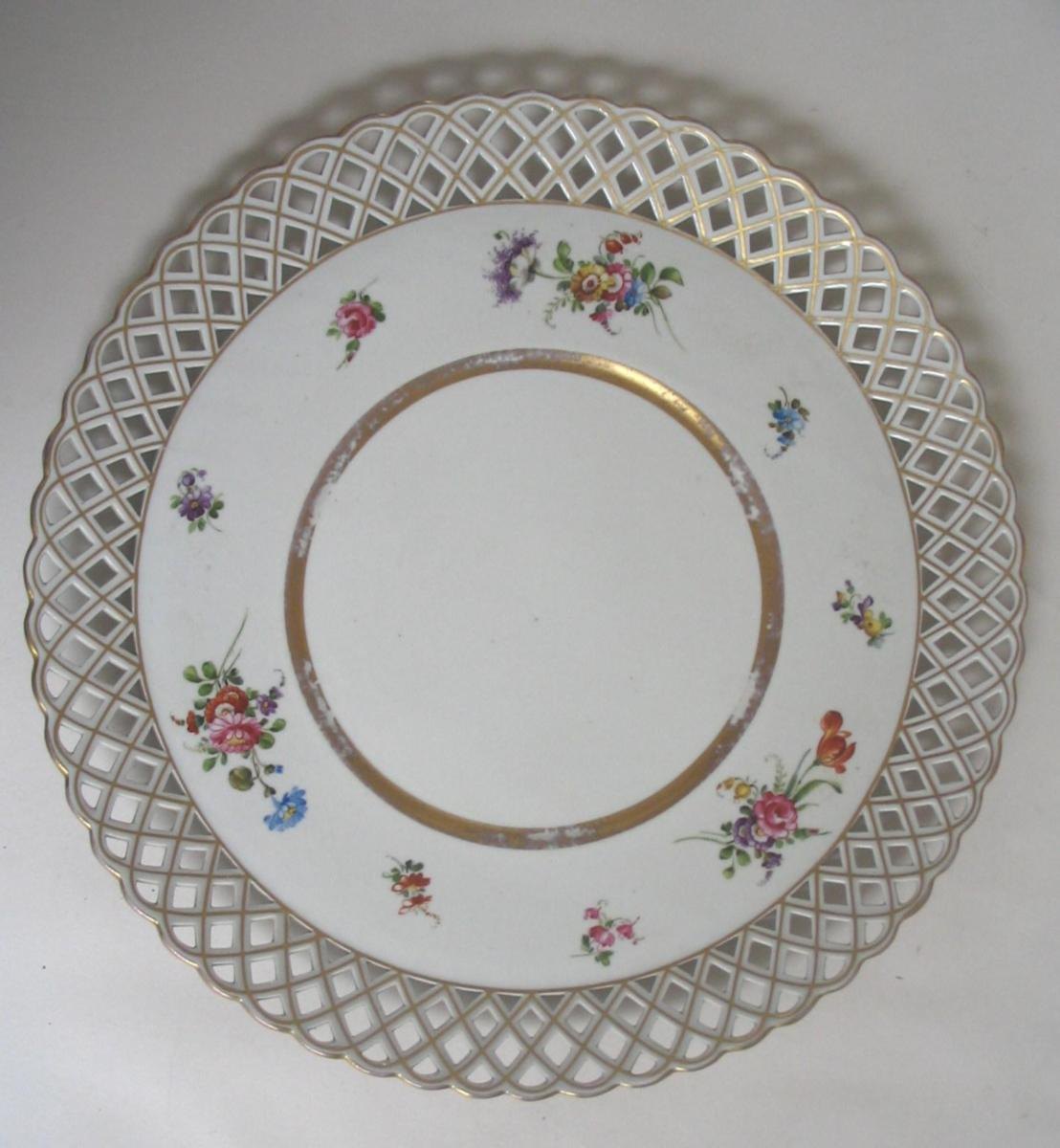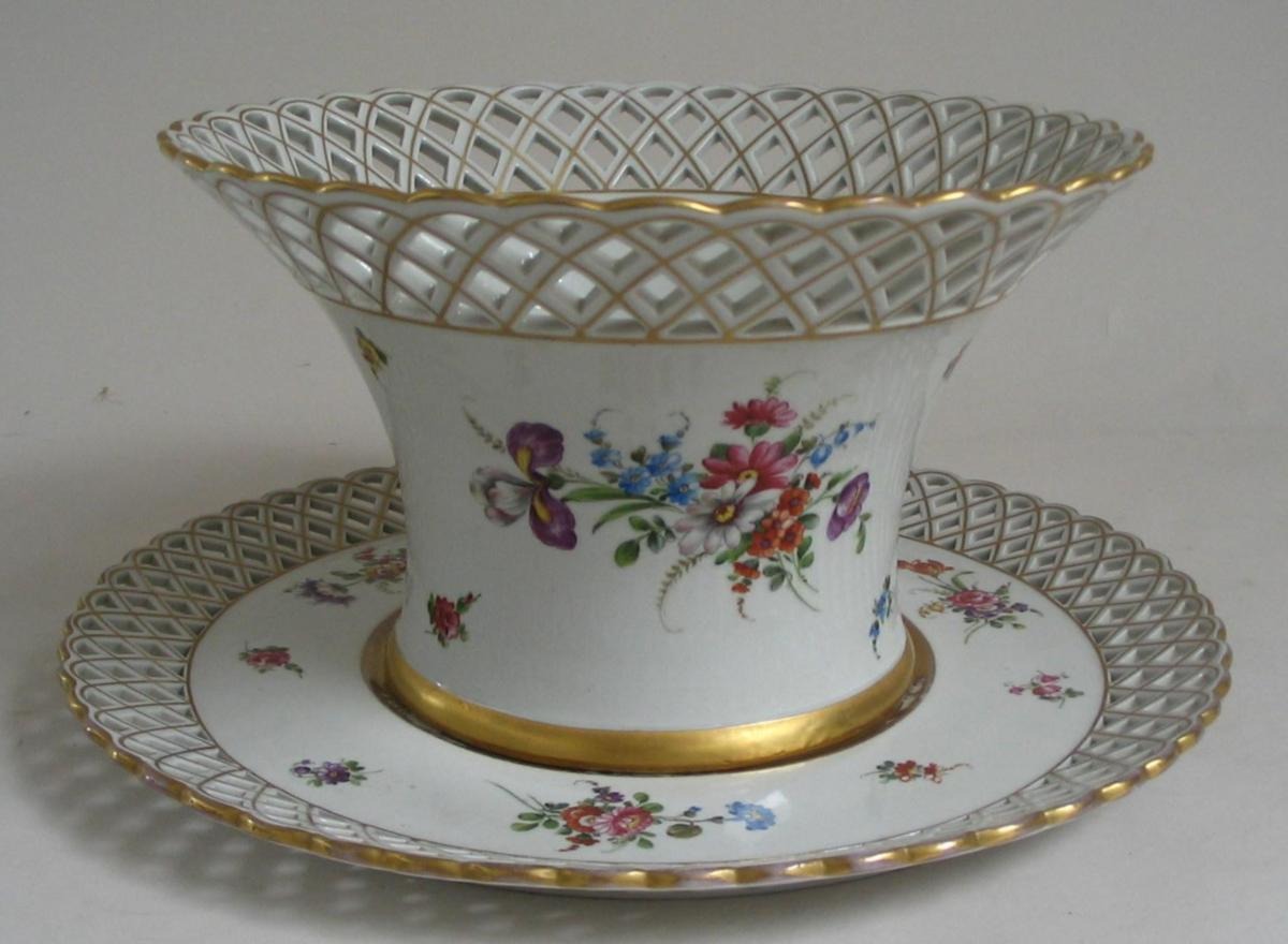 Gennembrudt porcelænskurv med skål, Tyskland, 20. årh., Schirholz, Håndmalede blomster på både kurv og fad og forgyldninger. Fad dia.: 31,5 cm. Højde kurv.: 15 cm. Dia.: 24,5 cm. Fejlfri!