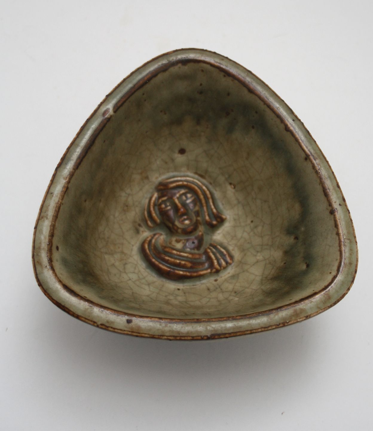 Royal Copenhagen, Jais Nielsen (1885 - 1961), Trekantet skål med ansigt i bunden. Brunlig glasur. Stentøj. Trekantet form. Højde 6,5 cm. 13 x 13 cm. Signeret JAIS. I. sortering. Pris: 950 kr.