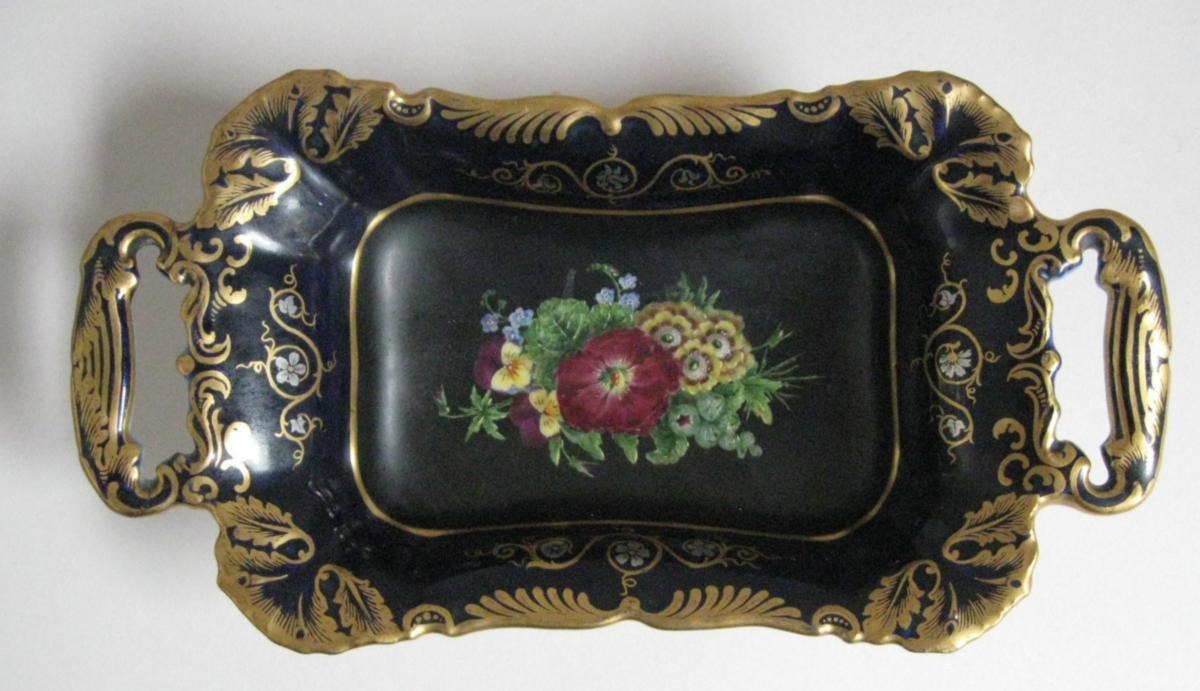 Porcelain bakke, Den kongelig Porcelænsfabrik, København, Danmark, 19. årh. Blå dekoreret med forgyldninger og blomstermaleri med stedmoderblomster, primula, forglemigej og stokrose. Med ører. L.: 21 cm. B.: 11 cm. H.: 4,5 cm. Limet ved det ene øre. Stemplet med de tre bølger og A i guld - ældre end 1884.