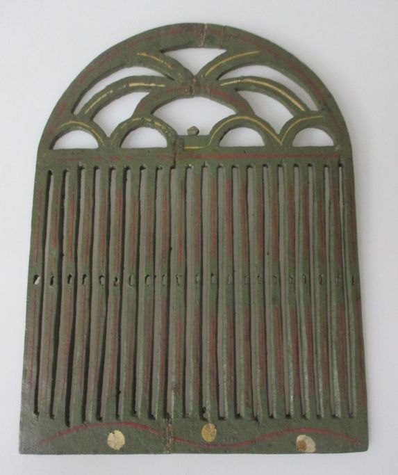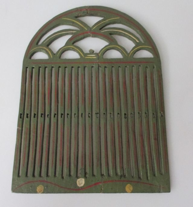 Antik dansk bemalet væve spjæld, ca. 1820. Empire. Grønbemalet med rødt og hvidt. Med skæringer. 25,7 x 18,8 cm. Limet.