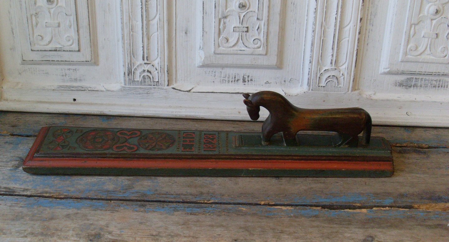 Flot karvkåret dekoration, de traditionelle cirkler samt hjerter. Håndtag i form af hest.