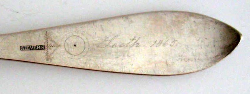 Skipper ske i sølv fra Baltikum, 19. årh. På skaft punslet med dekoration og vase. På bagsiden mesterstempel: Sievers. Dertil punsling med cirkel og trekant, og navnet: Seeth 1863. L.: 23,5 cm.