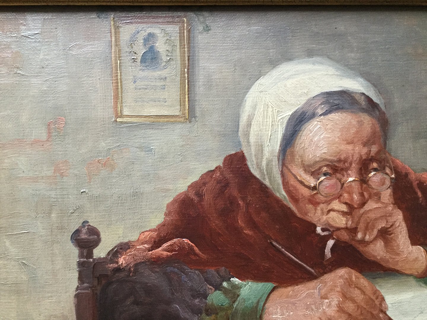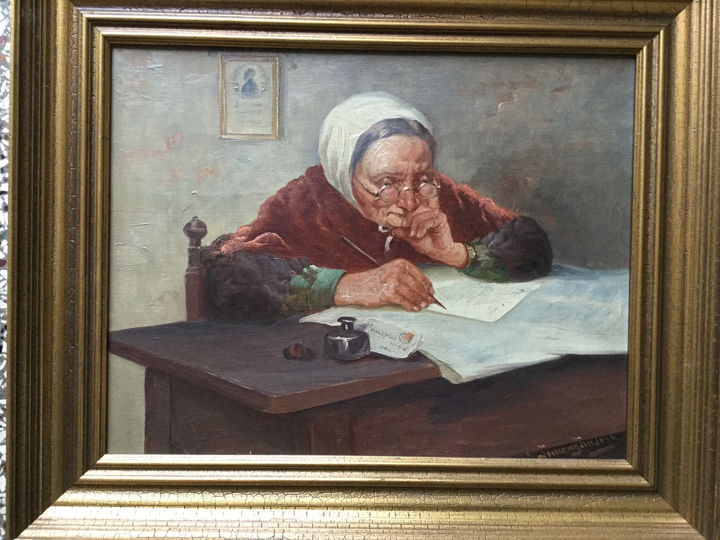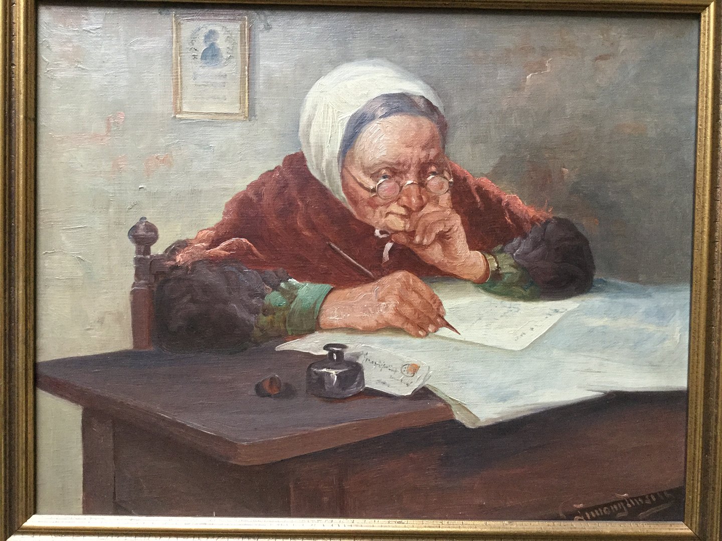 Maleri af Simony Jensen - Gammel kone skriver brev i stuen.