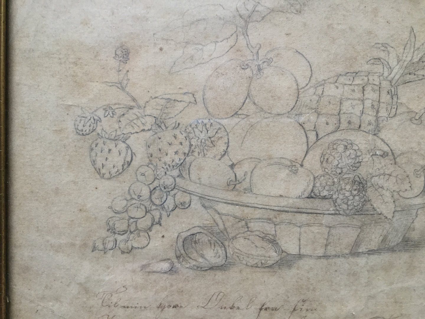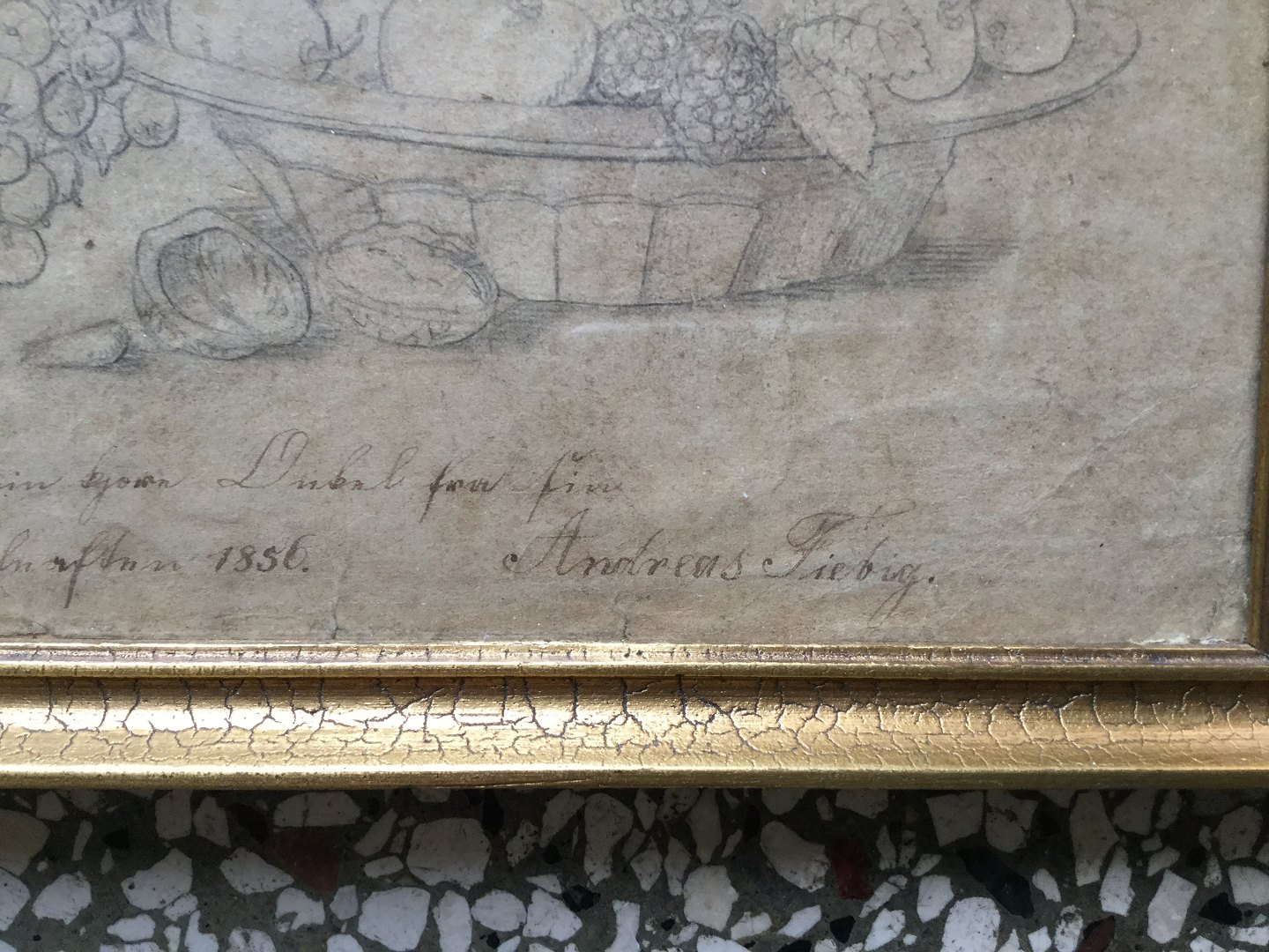 Tegning af Andreas Fiebig 1856 - Skål med frugt og nødder.