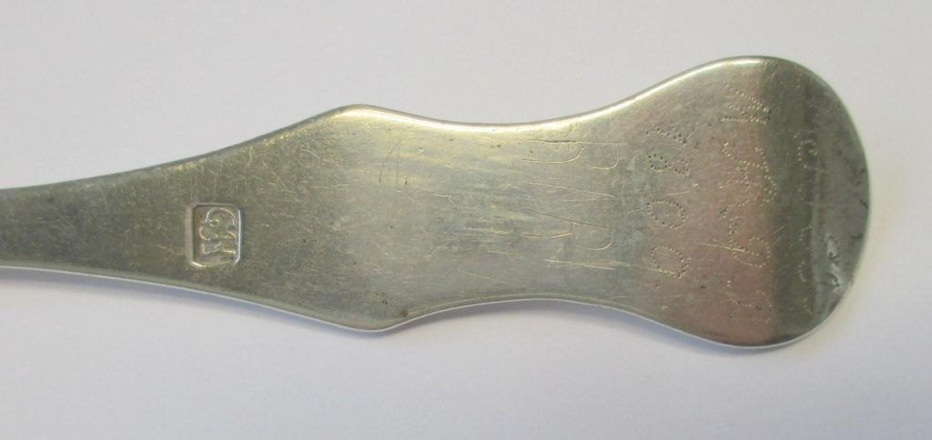 Sølvske, mester Claus Hestorff (ca. 1774 - 1833?) Tønder, Danmark. Violin mønster. Med rococo graveringer på laf. Stemplet: Cl H. Med indgravering: RJJSB - MJRS 1800. Senere indgravering: RIR. Længde: 19,3 cm. Vægt.: 39 gram.