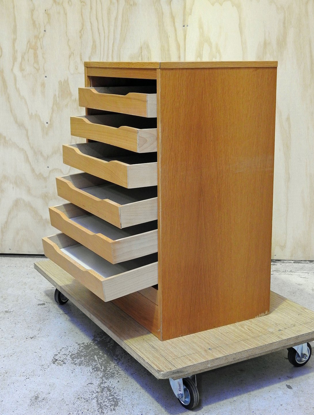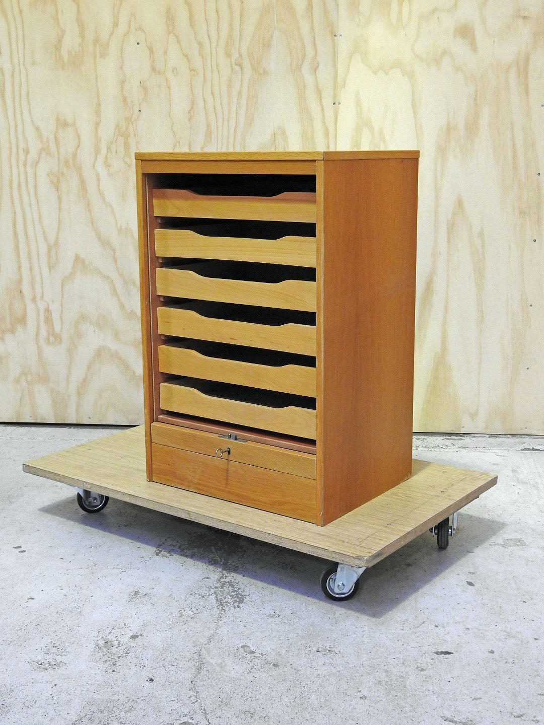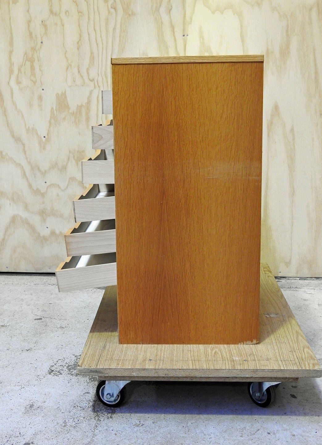 Arkivskab i lakeret eg. skabet er med 6 skuffer og jalousi låge.