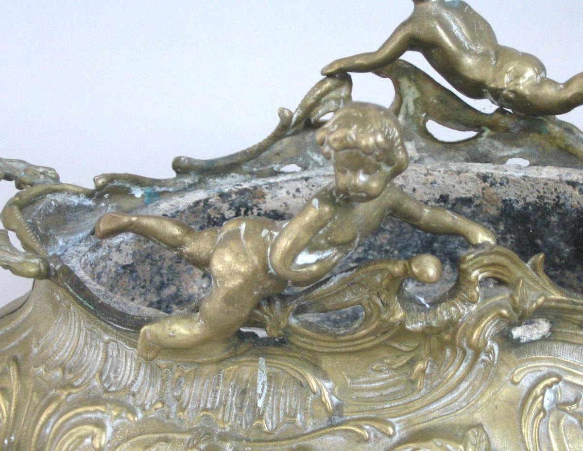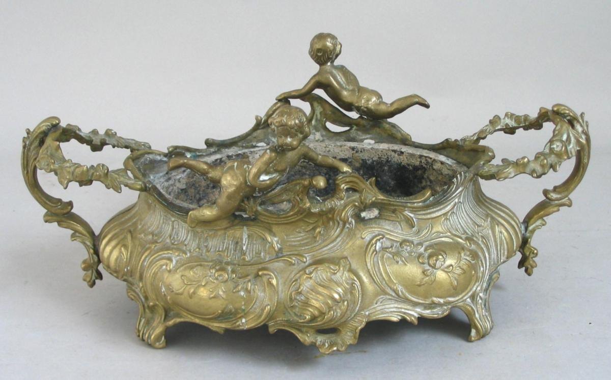 Fransk nyrococo jardiniere, 19. årh. Korpus med dekorationer i form af rocailler og blomster, hanke som blomsterranker og to topfigurer i form af engle. Indsats i jern blik. L.: 38 cm. H.: 16 cm.