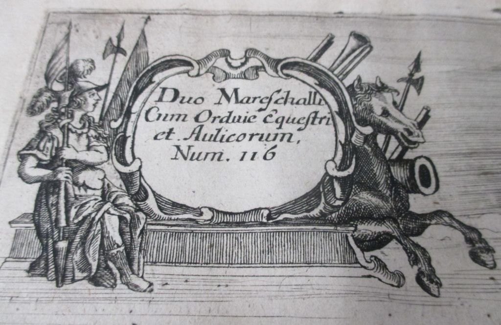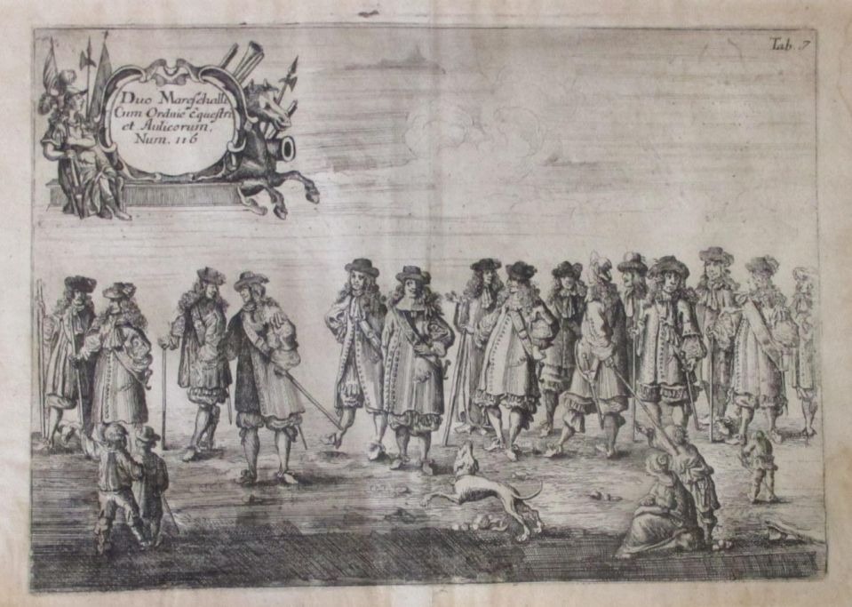 Duo Mareschalli Cum Orduie Equestri a Aulicorum, Num 116. Etchings from the mid-1600s. Illustration no. 7 from book work: Christiano-Albertinæ Inavgvratio.