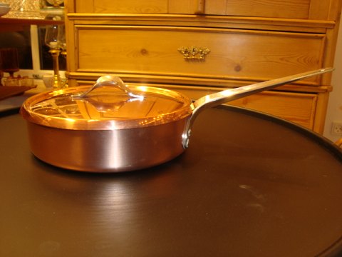 Georg Jensen Sauterpande m. låg udført i kobber, design Henning Kobbel i 1971. Diameter 20 cm, højde 6 cm, i fin stand.
