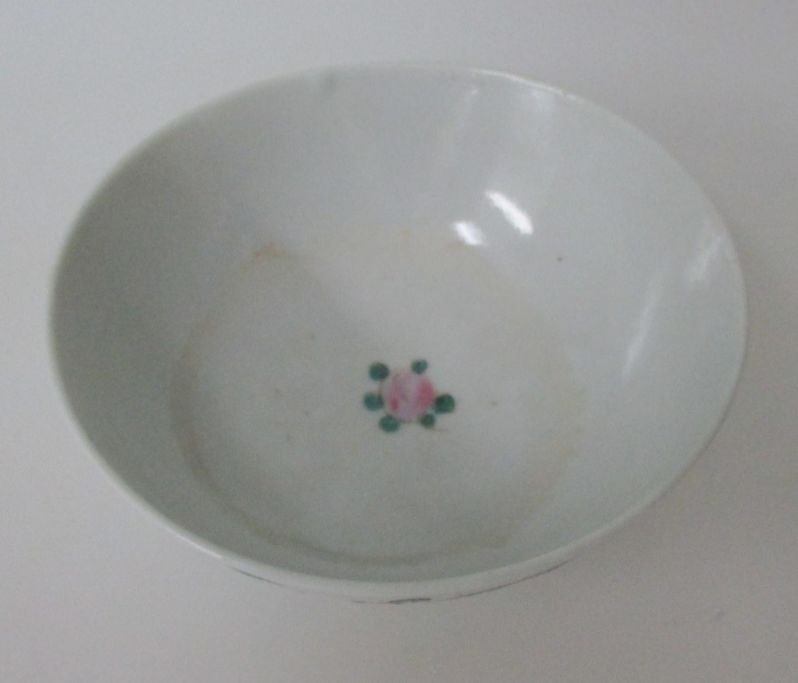 Antique Porcelain Bowl on Foot, China, Famille Verte, Approx. 1860. Height: 5 cm. Slide: 12 cm. Polycrom decoration with flowers and insects. Stamped.