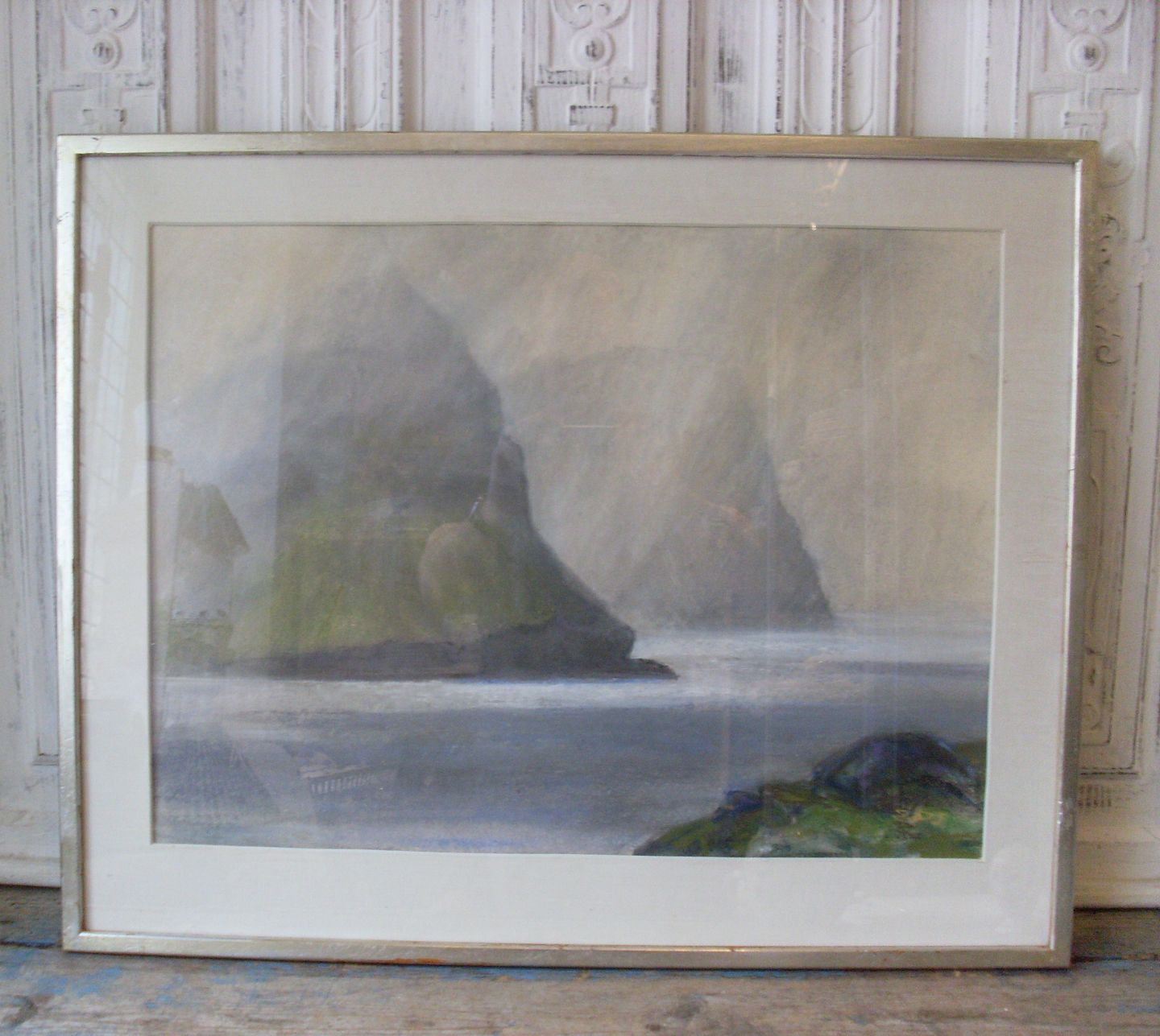 Edith Dueholm Jessen, oliekridt på papir, klippekyst fra Færøerne.