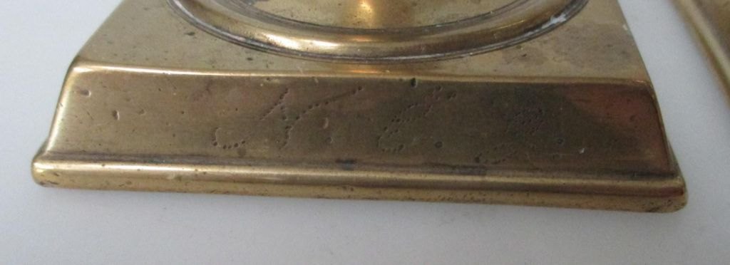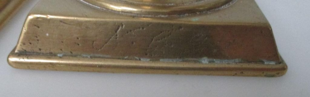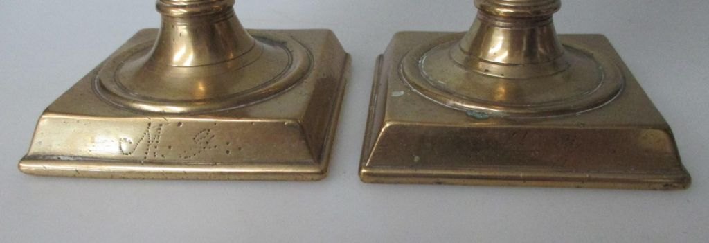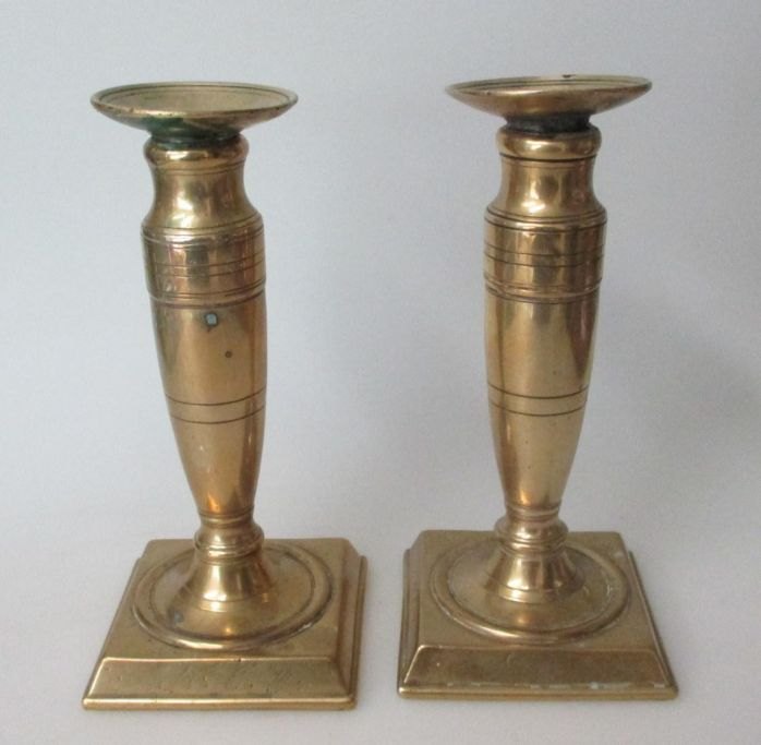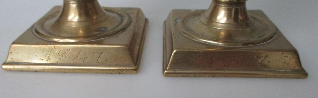 Par messing tulipan stager, 1847, Danmark. Med firkantet fod. På faod indgraveringer: 1847, M.J. og N.C.J. Højde.: 17 cm.