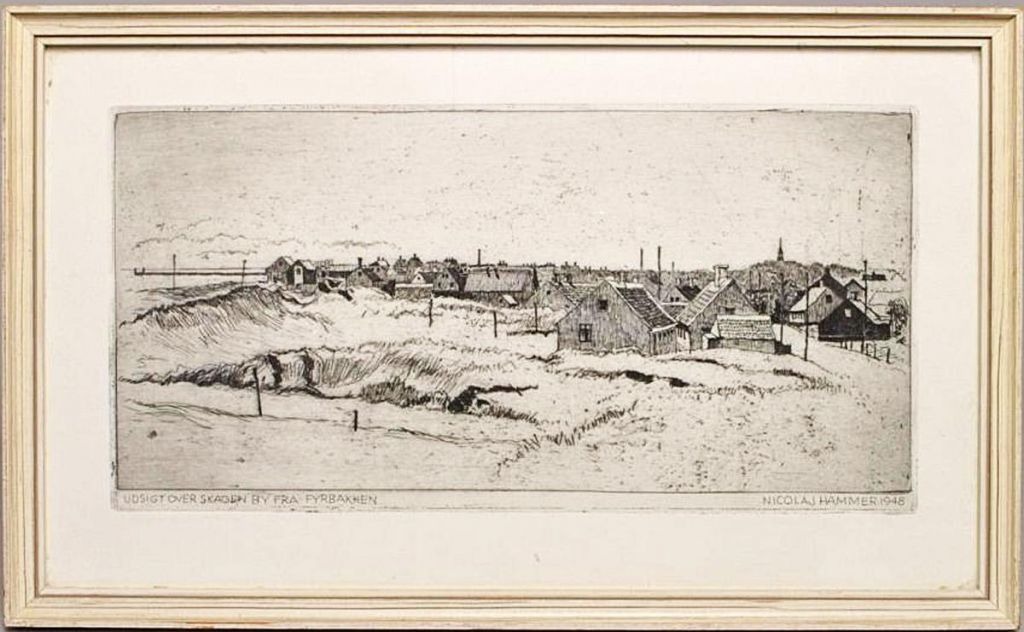 Hammer, Nicolaj (1887-1970) Danmark. Udsigt over Skagen fra Fyrbakken. Radering. Signeret: Nicolaj Hammer, 1948. 18,5 x 32 cm.